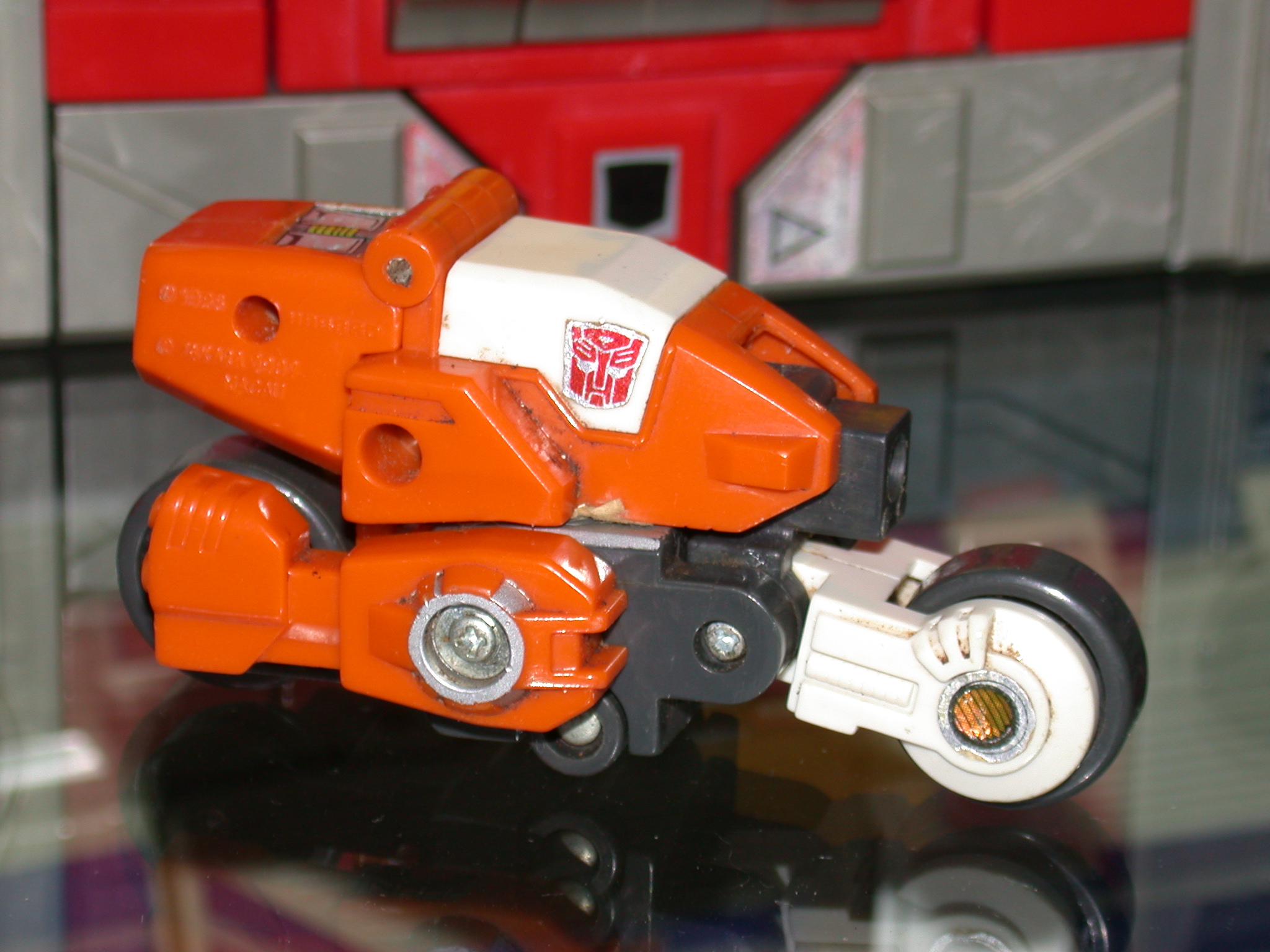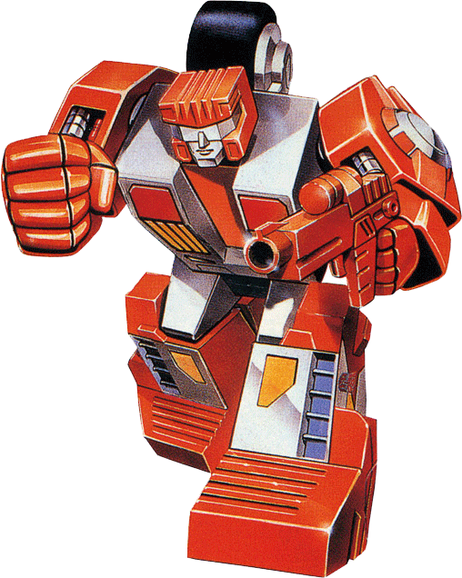 Quick to anger, even quicker to attack. Defiant, uncooperative, nasty tempered. Hates authority. In vehicle mode, uses solid rocket fuel packs to boost speed to 450 mph. Tires secrete adhesive that enables him to drive up most walls. Carries 2 laser-guided incendiary missiles, rapid-fire plasma pulse cannon. In robot mode, uses semi-automatic sonic blaster pistol. Combines with fellow Technobots to form Computron. | |||||||