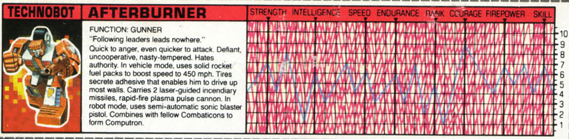 Abilities: In his vehicle mode, Afterburner uses solid rocket fuel packs to boost his speed up to 450 mph for several minutes at a time. A special adhesive substance secreted by his tires allows him to drive up all but the most slippery walls. He carries two laser-guided incendiary missiles and a rapid-fire plasma pulse cannon, which shoots discrete packets of energy that explode on contact. In robot mode, he uses a semi-automatic sonic blaster pistol with infrared sight. He combines with his fellow Technobots to form the giant robot known as Computron.
