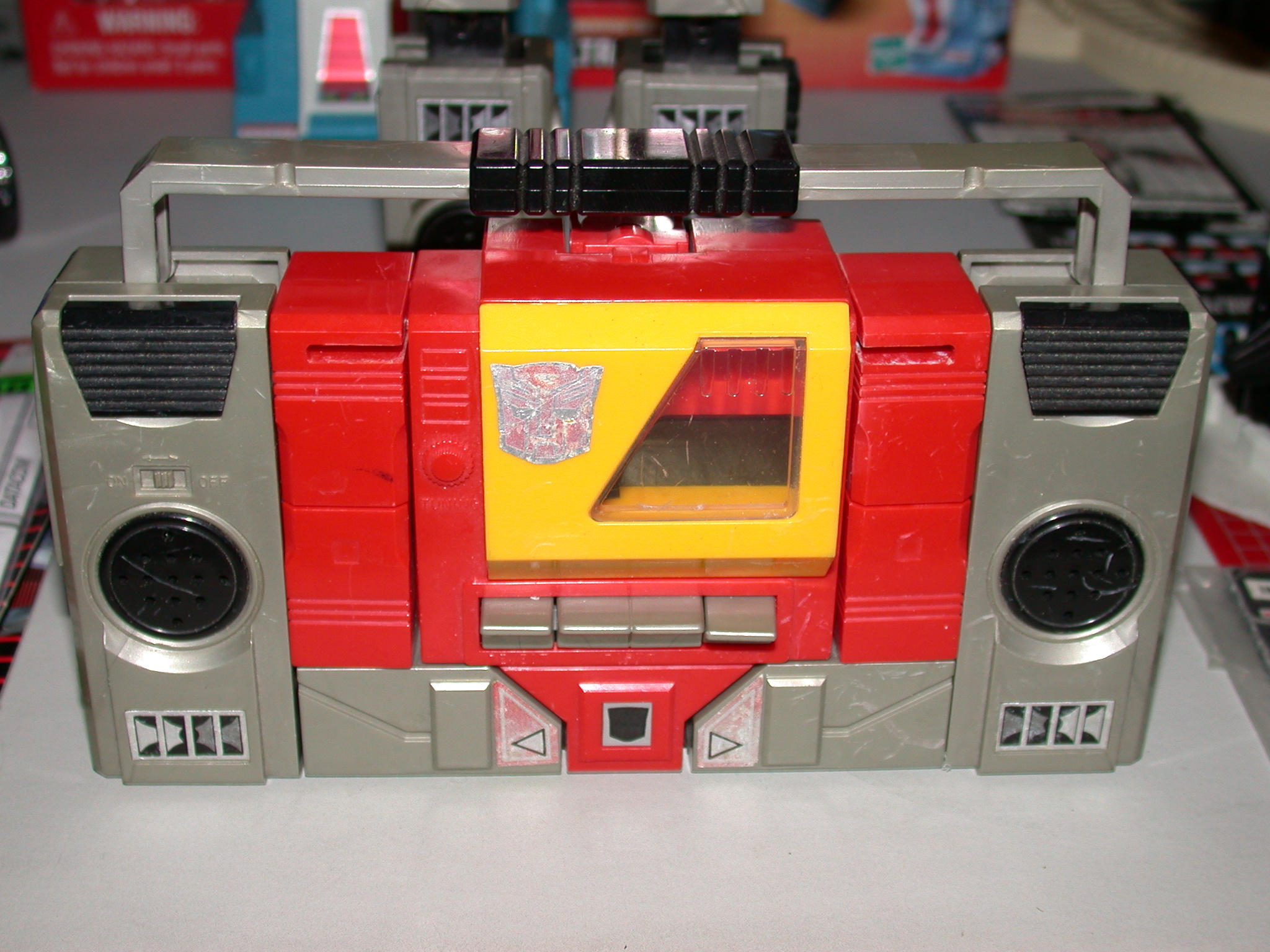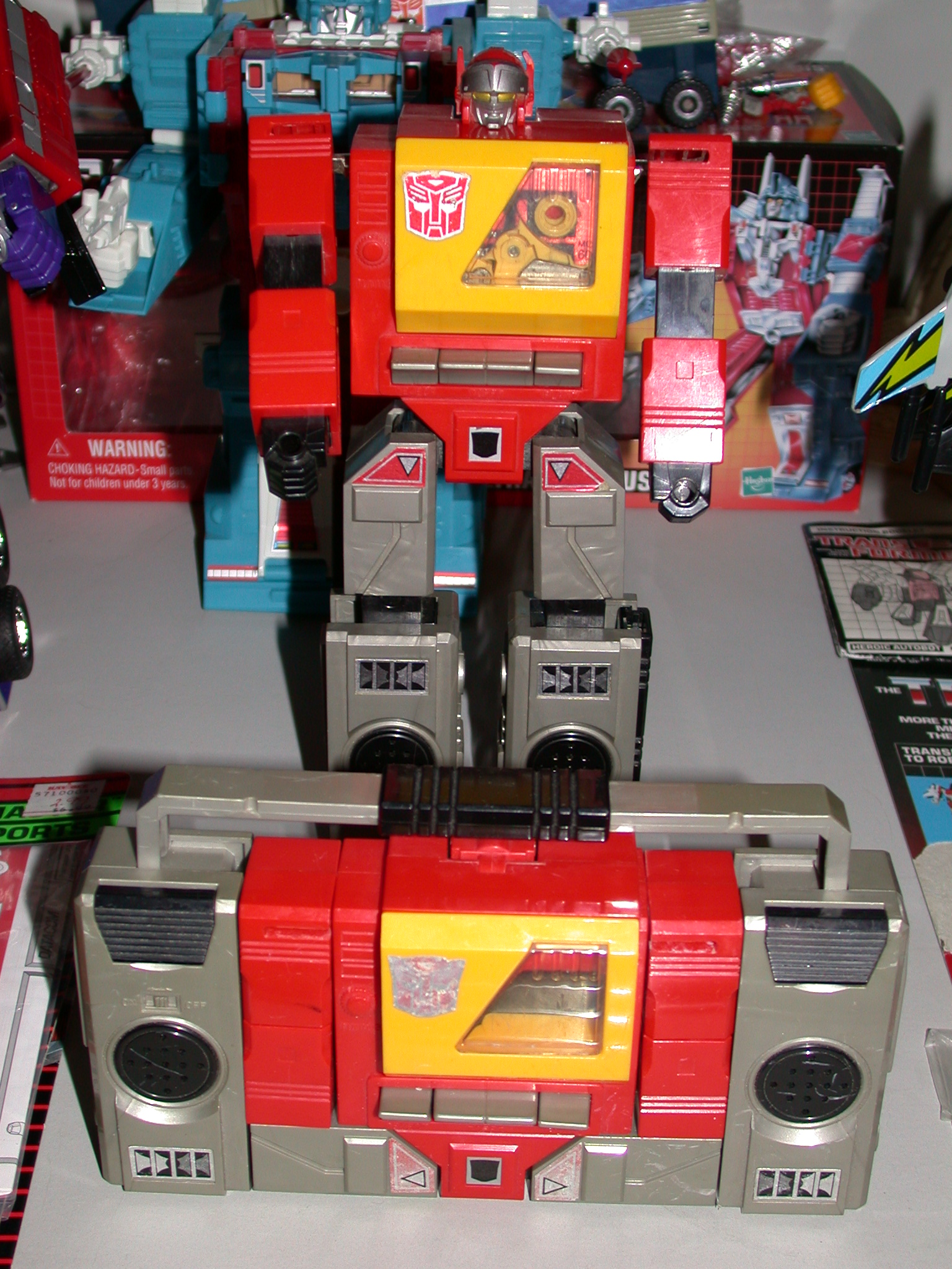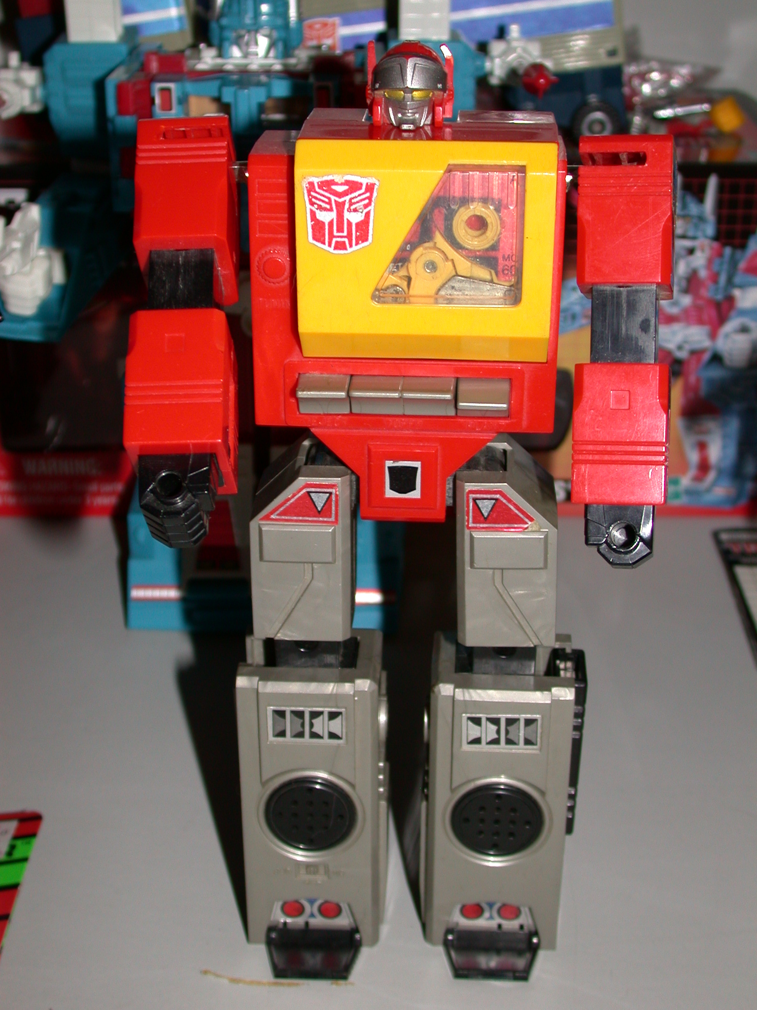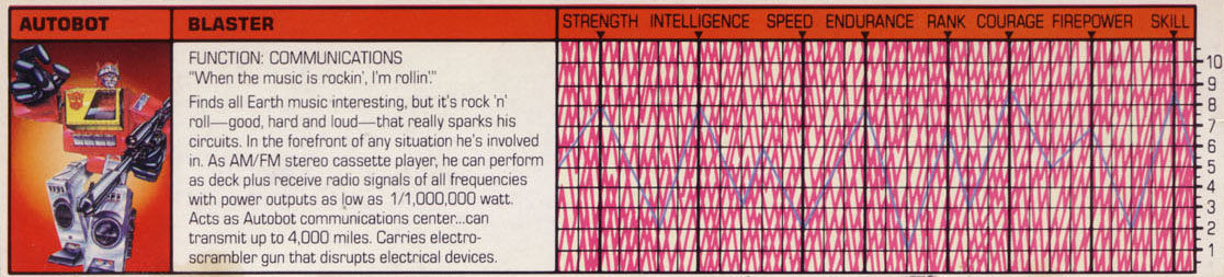 Finds all Earth music interesting, but it's rock'n'roll -- good, hard and loud -- that really sparks his circuits. In the forefront of any situation he's involved in. As AM/FM stereo cassette player, he can perform as deck plus receive radio signals of all frequencies with power outputs as low as 1/1,000,000 watt. Acts as Autobot communications center... can transmit up to 4,000 miles. Carries electro-scrambler gun that disrupts electrical devices.