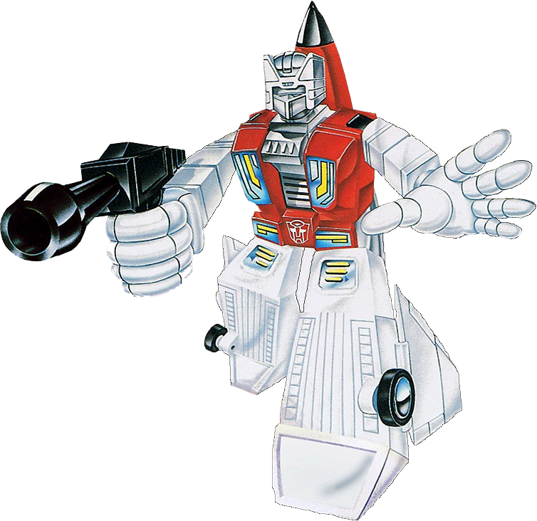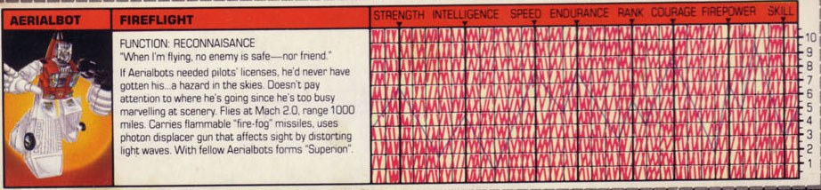 Abilities: Fireflight can fly at speeds up to Mach 2.0 with a range of 1000 miles. In jet mode, he can shoot missiles that explode and release a mist of highly flammable liquid he calls "fire-fog." In robot mode, he uses a photon displacer gun, which severely distorts visual images by altering the course of photons in light waves. Anyone within the vicinity of a blast from this gun would not be able to see things as they actually are until after the gun's effects wear off, which can take up to five minutes. He combines with his fellow Aerialbots to form the giant robot known as Superion.