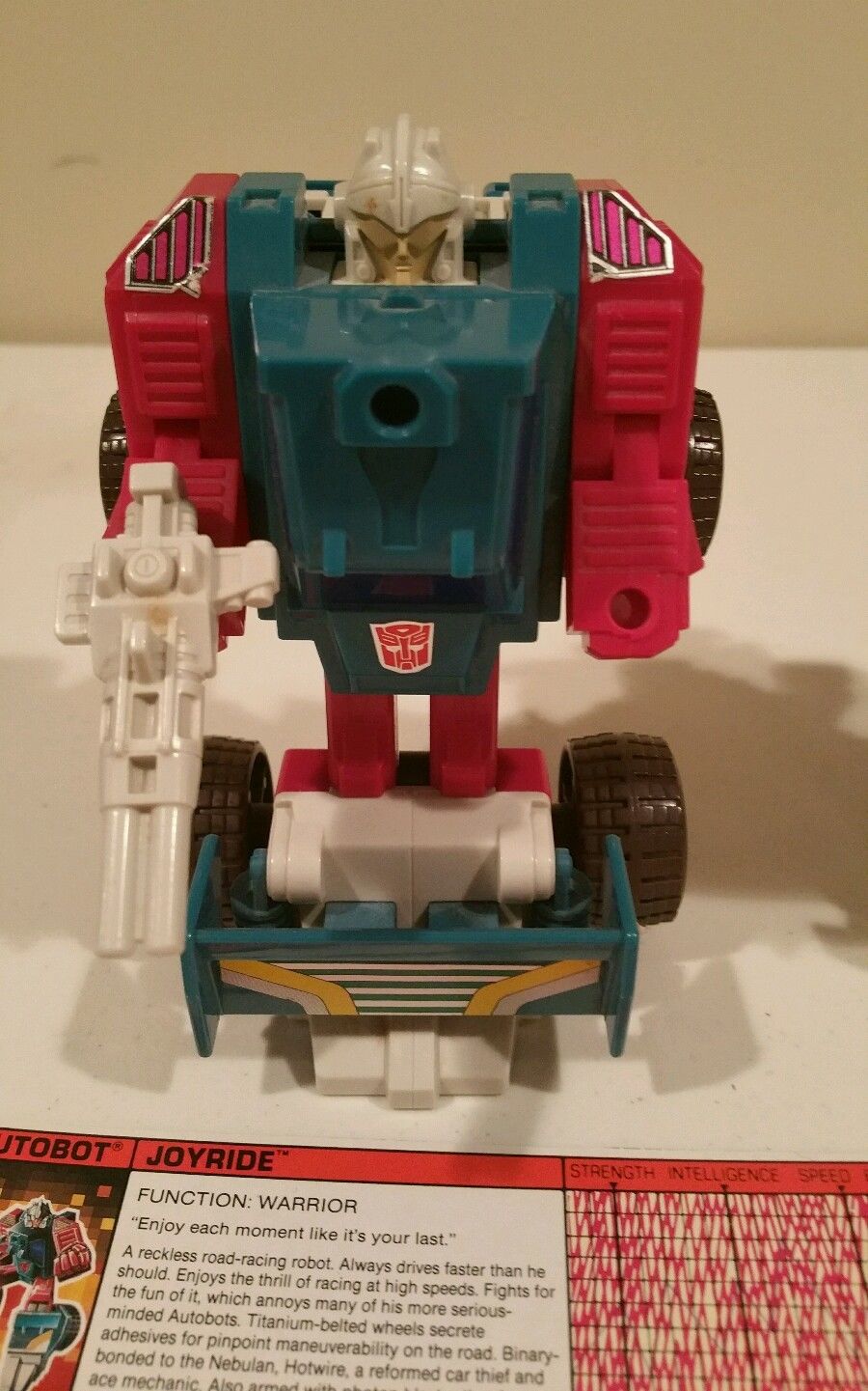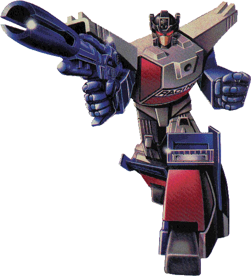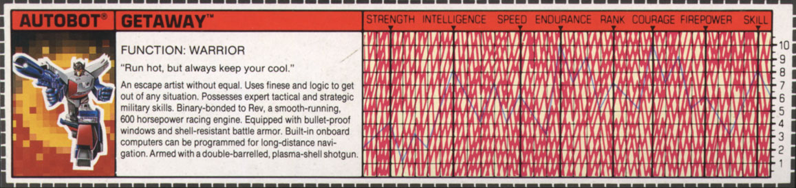 Abilities: Getaway is a master military strategist. In vehicle mode his 600 horsepower racing engine (Rev in engine mode) allows him to reach speeds of 540 miles per hour. He is equipped with bullet-proof windows and shell-resistant battle armor. His range is 1200 miles. An on-board computerized navigational system allows him to plot a long-range course in advance, so that he can give his attention to other matters as he travels. He is armed with a double-barrelled plasma-shell shotgun.