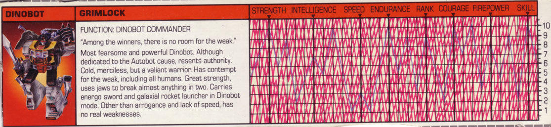 Abilities: Grimlock's strength is second only to Optimus Prime's, and even that is arguable. In Dinobot mode he can use his powerful jaws to snap in two virtually anything that comes between them - from a 4-foot diameter steel cable to a Decepticon leg. In Autobot mode he wields an energo-sword, which can slice a 2-foot thick concrete wall with one sweep of its crackling blade. He also uses a double-barrelled, self-propelled rocket launcher.