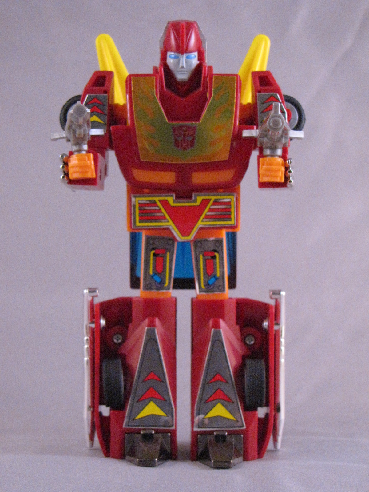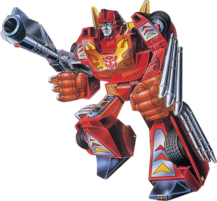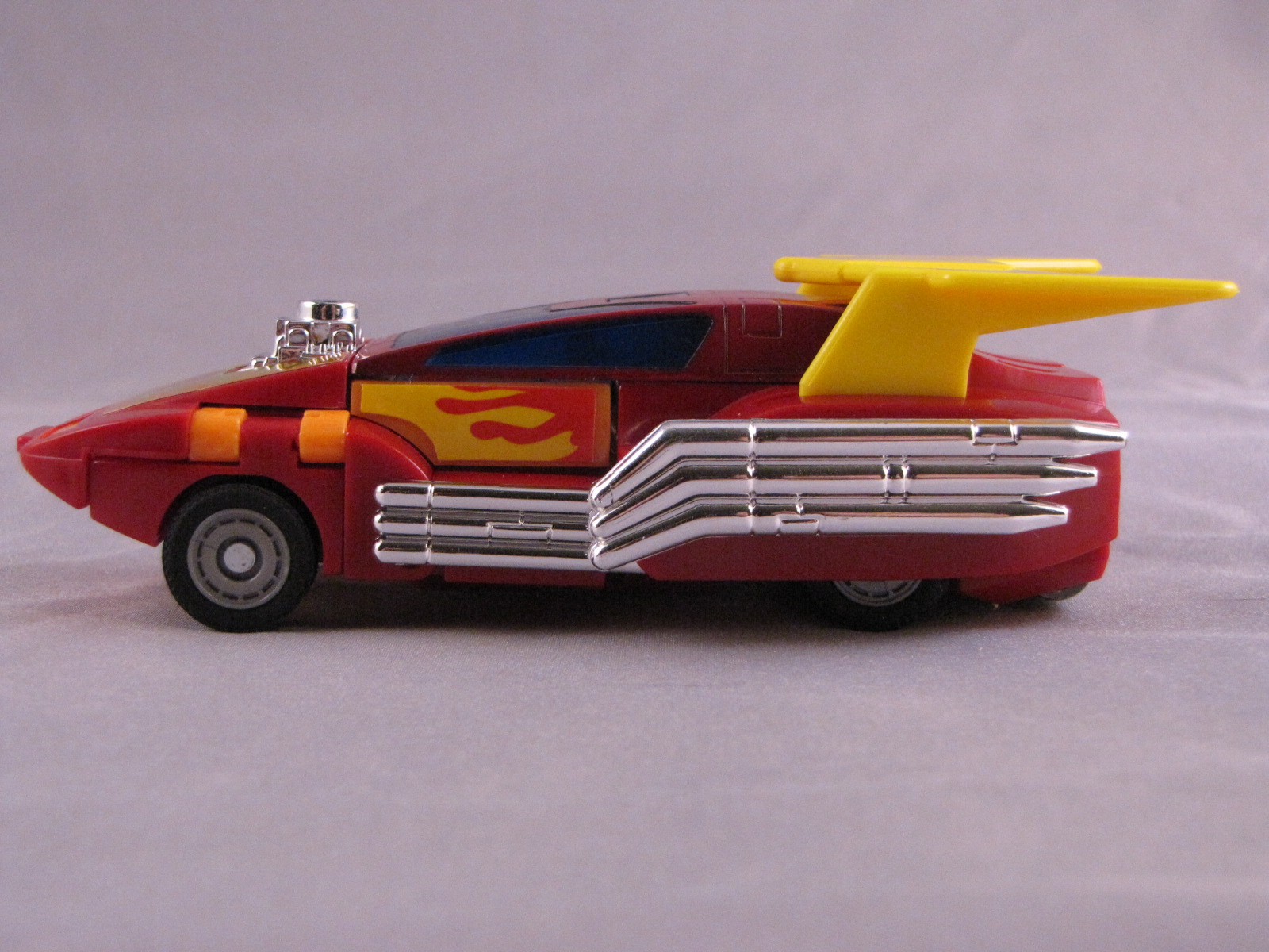 Profile: Hot Rod is the all-American-boy Autobot. Not too sweet, not too sharp, not too snotty... not a goodie-goodie, but basically a typical adolescent who has dreams of doing great stuff and being as heroic and important as Optimus Prime and other famous and revered top Autobots. He tends to follow rules until they bug him - and he sometimes learns, to his regret, that disobeying wasn't exactly smart. And he often acts without thinking in an effort to do the right thing - and this gets him and sometimes his friends in trouble. But he's not afraid when trouble does arrive and is a brave and honorable fighter and friend. He is especially close to Kup, the grizzled old mentor of an Autobot, although he sometimes resents hearing "wisdom." And he likes Daniel, the Earth kid, a lot. (In a way, Hot Rod is big brother to Daniel - a role model - and Hot Rod knows it and takes the responsibility seriously.) In robot or automotive mode, Hot Rod is sometimes hot-headed, but always a well-meaning, admirable "lad" and popular with all who know him.