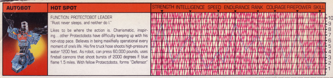 Abilities: In his fire truck mode, Hot Spot can travel at 90 mph and has a range of 600 miles. His hose line can shoot streams of high-pressure water (and other non-corrosive fluids, such as oil and alcohol) an effective distance of 1200 feet. In robot mode, he possesses incredible strength: he can press 60,000 pounds. He uses a fireball cannon, which can shoot bursts of 2000 degrees Fahrenheit blue flame a distance of 1.5 miles. A special vanadium-steel alloy shields him from temperatures of up to 5000 degrees Fahrenheit. He combines with his fellow Protectobots to form the giant robot known as Defensor.