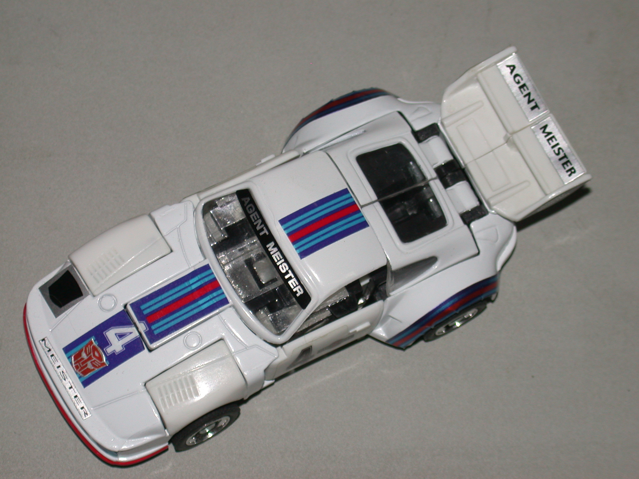 Abilities: In robot mode, Jazz can use his solar-powered photon rifle with deadly accuracy up to a distance of .9 miles from target, and he can shoot it from virtually any physical position he may be in with equal effectiveness. He can also use a combination of his overhead flame-thrower (maximum range of 250 feet), full-spectrum front grill beacon and 180 dB stereo speakers to create a spectacular, disorienting light and sound show. He has been known to glide for more than 3000 feet using his rear-mounted ailerons. His biggest asset is the versatility and cleverness he possesses in using the resources at his disposal.