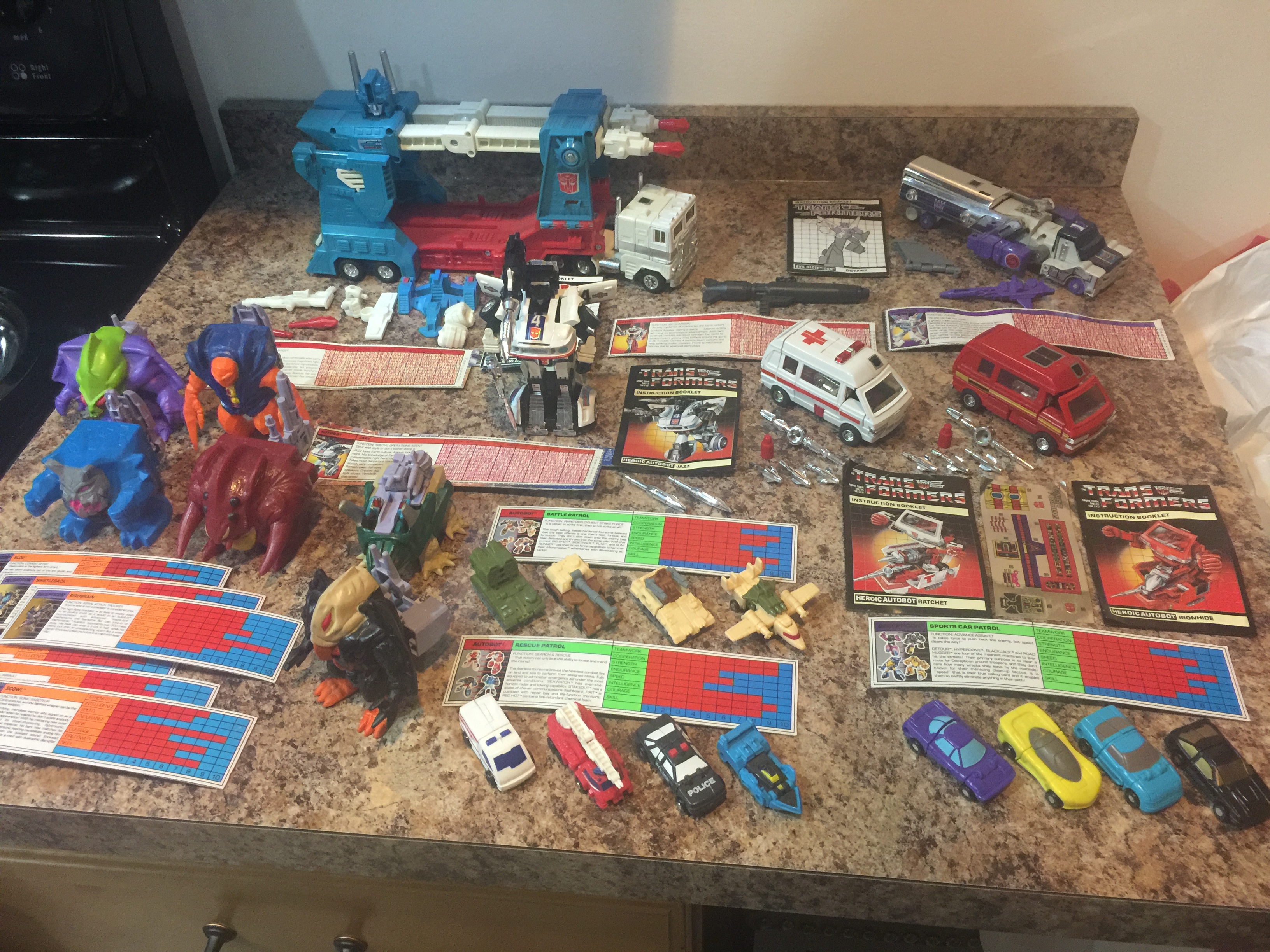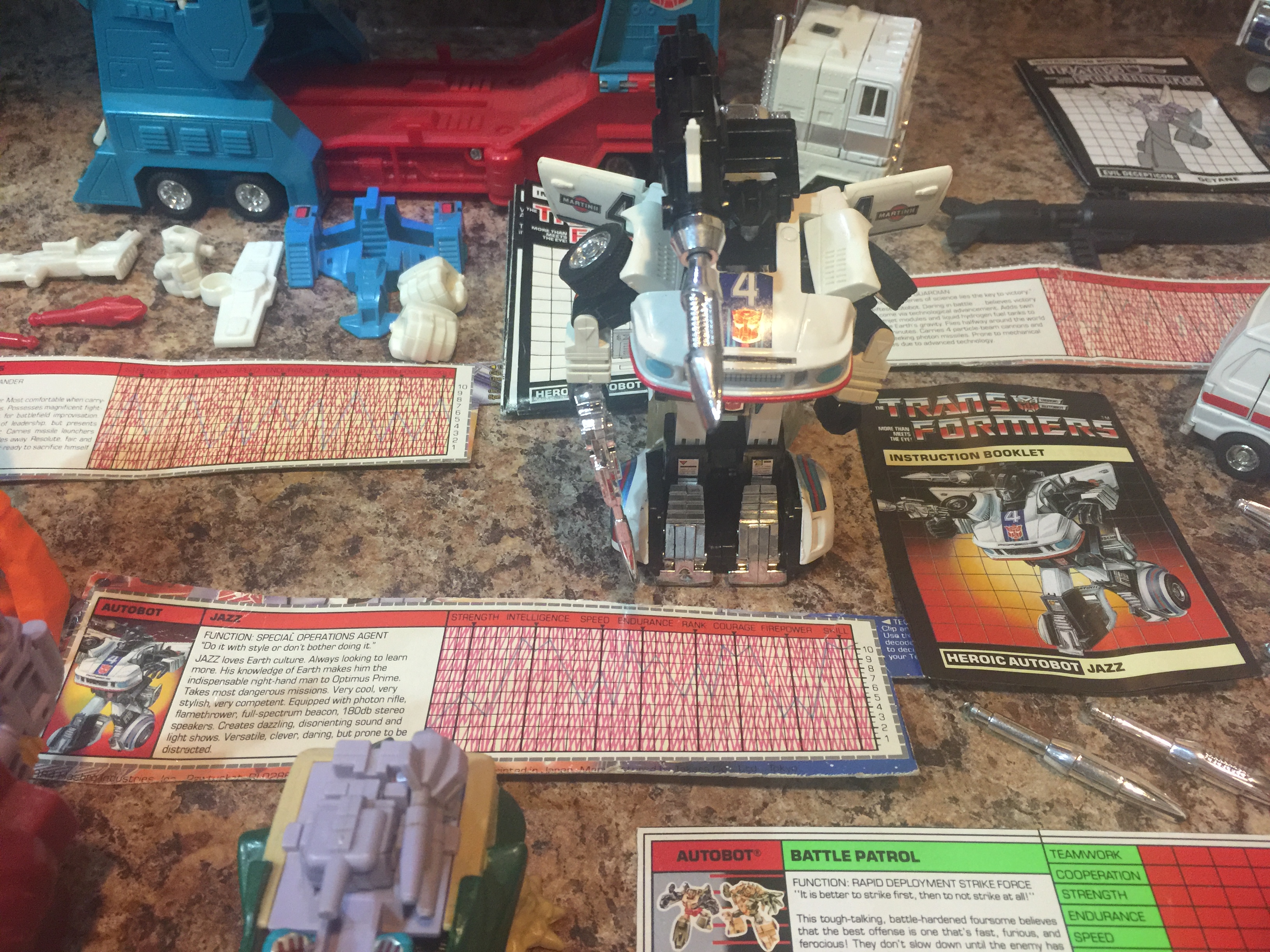 **Jazz is an original 1982 pre-rub that I picked up in a deal with a local friend in January 2016.  It was part of a large amount of awesome pieces I got in one really big loot pickup (first picture).  Nothing I can say can do him justice.  I would say he is mint except some peeling of one of his waist stickers, and think his shin stickers are not applied 100% correctly.  Otherwise, it is something to behold.  All paint is flawless and and I don't really notice any other blemishes.  He came complete with everything, including his Photon rifle, missile launcher, all 3 missiles, instructions and tech specs.  Really, really proud of this guy.