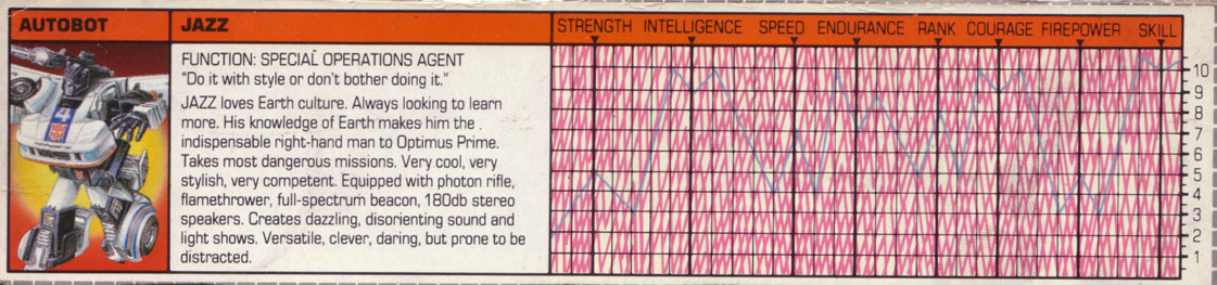 Profile: Jazz would be cruising down Bourbon Street in New Orleans or be double-parked outside a cellar club in Greenwich Village soaking up the local sounds if he weren't in the middle of a war. He's a confirmed Earthen culture junkie - he can talk fluently about ballet or break-dancing (although he prefers the latter), and he's always on the lookout for more stuff to turn on to. His knowledge of Earthen ways and his easy adaptability to Earthen environments make him the indispensable right-hand man of his commander, Optimus Prime. He's often given the most dangerous assignments, and, with characteristic coolness, usually pulls them off using something out of his seemingly bottomless bag of tricks. He'd rather dazzle you with style than accomplish a mission the easy way.