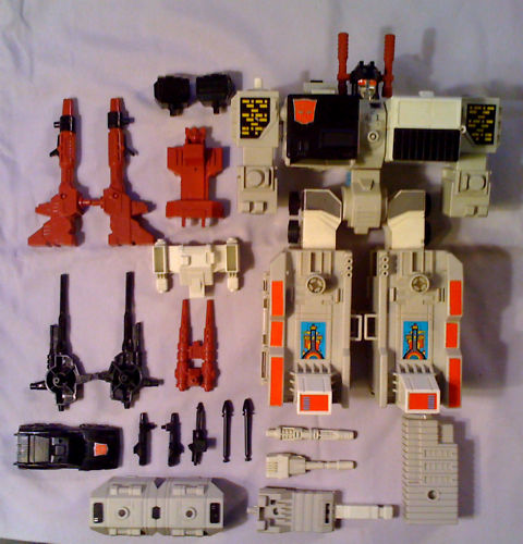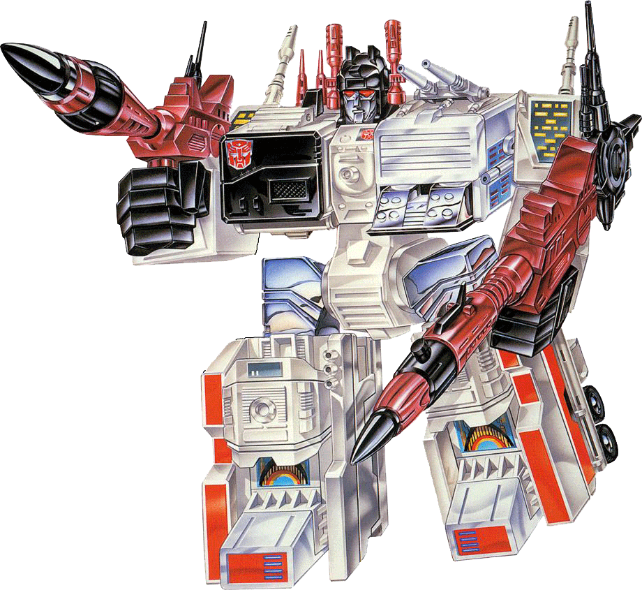 Startlingly versatile, staggeringly strong, the Autobot's last line of defense... a mighty instrument of titanic destructive force. Extremely modest about his achievements... berates himself for not doing more. In robot mode, he can lift 70,000 tons, has shoulder-mounted twin high-energy maser cannons and omni-directional receiving and transmitting antenna. In city mode, has helipad and fully equipped repair bays that can handle four vehicles at once. Left rear tower transforms into tank, Slammer, who has rocket-propelled mortar cannon. Scamper is sports car with side mounted electro-blasters; transforms into robot, uses high-energy particle beam pistol. Six-gun is small robot, has ion-pulse rifles for arms, twin surface-to-air guided missile launchers on back, acetylene pistol. In battle station mode, uses all these weapons and twin disrupter rays, laser lances, powerful anti-matter projectors.
