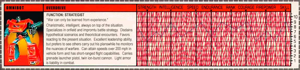 Charasmatic, intelligent, always on top of the situation. Specializes in on field and impromptu battle strategy. Disdains hypothetical scenarios and theoretical encounters. Favors reacting to the present situation. Excellent leadership ability, but prefers to see others carry out his plans while he monitors the nuances of warfare. Can attain speeds over 200 mph in vehicle form and has short-ranged flight capabilities. Carries grenade launcher pistol, twin ion-burst cannon. Light armor is liability in combat.