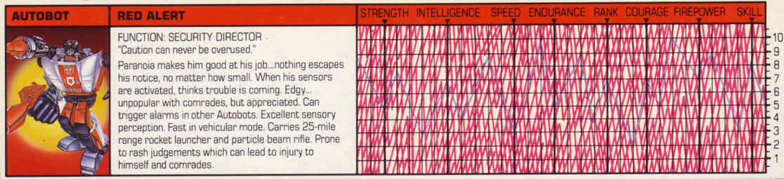 Profile: Paranoia is the character trait that makes Red Alert as good as he is at his job. Nothing escapes his notice - a whiff of smoke, a whisper of crackling electricity, a faint scent of fuel exhaust. Anything, no matter how small, that triggers his sensory circuitry directs his thoughts immediately to the expectation of trouble. Most of his comrades find his edgy, driven nature an unwelcome presence among their ranks, but they all appreciate his dedication to his duty. "He may have a few wires crossed in his logic center," says Inferno, "but at least his optical sensors are looking straight ahead."