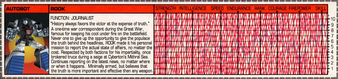Profile: A one-time war correspondent during the Great War, Rook was famous for keeping his cool under fire on the battlefield. Never one to give up the opportunity to give the populace the truth behind the headlines, Rook made it his personal mission to report the actual state of affairs, no matter the cost. He never distinguished between Autobot and Decepticon - each had their own stories to tell, regardless of their philosophy. Welcomed by Optimus Prime and tolerated by Megatron, Rook gained the respect of both faction leaders by refusing to back down from asking the tough questions, even if it meant jeopardizing his life or career. Rook became infamous during a particularly brutal siege, where Megatron and his troops were cornered in a abandoned outpost on the far side of Cybertron's Mithril Sea. He entered the fortress and convinced Megatron to work out a temporary withdrawal from the region. The irony of the situation was he had already convinced Optimus Prime of the very same thing! After a tense stalemate, both sides withdrew from the warzone and refocused their resources elsewhere during the war. When peace finally came to Cybertron, Rook realized his negotiation skills could be put to use with his penchant for reporting. Capitalizing on his celebrity status from his wartime exploits, Rook is able to get the real story behind the latest news no matter where, and when, it happens.