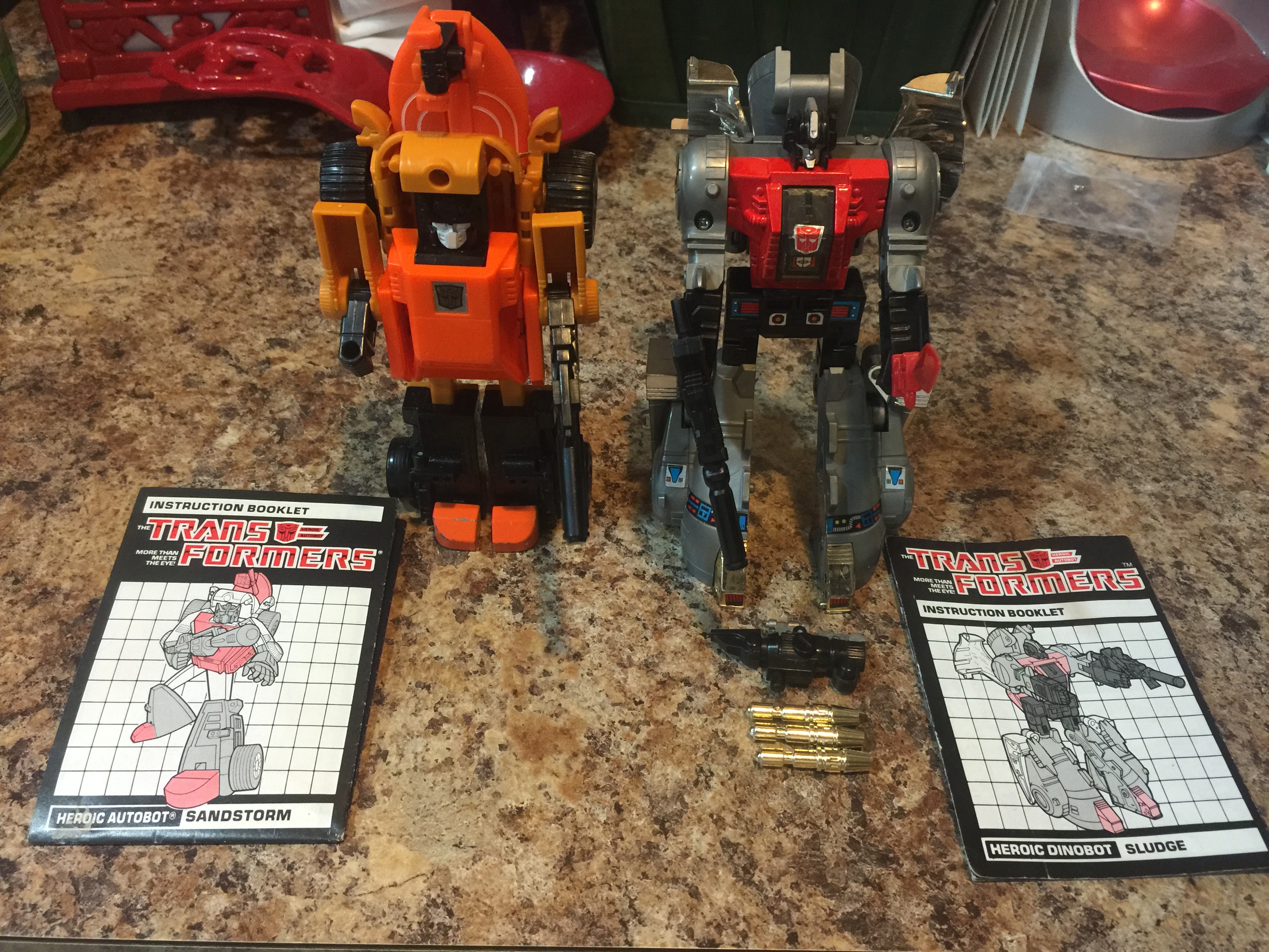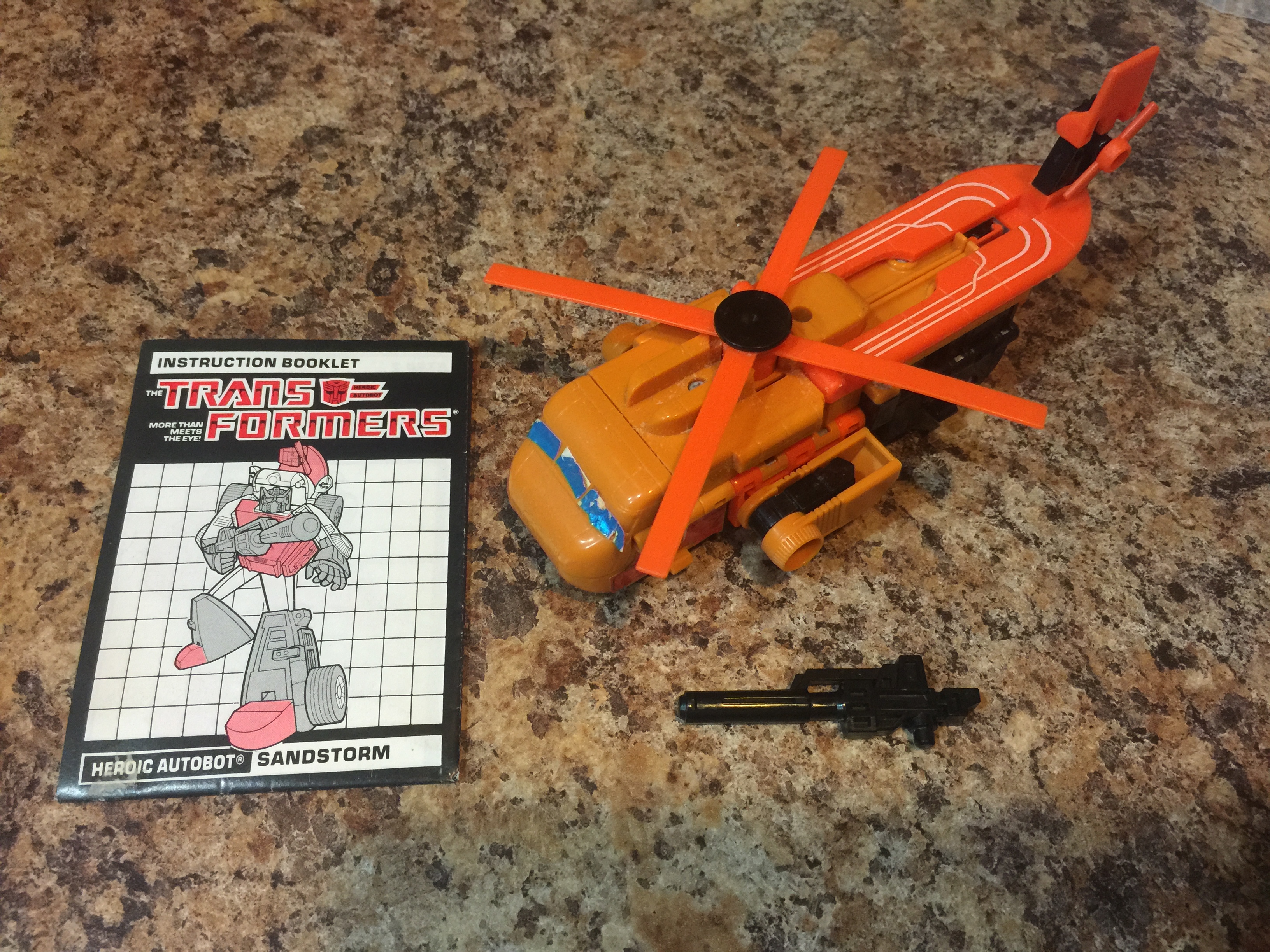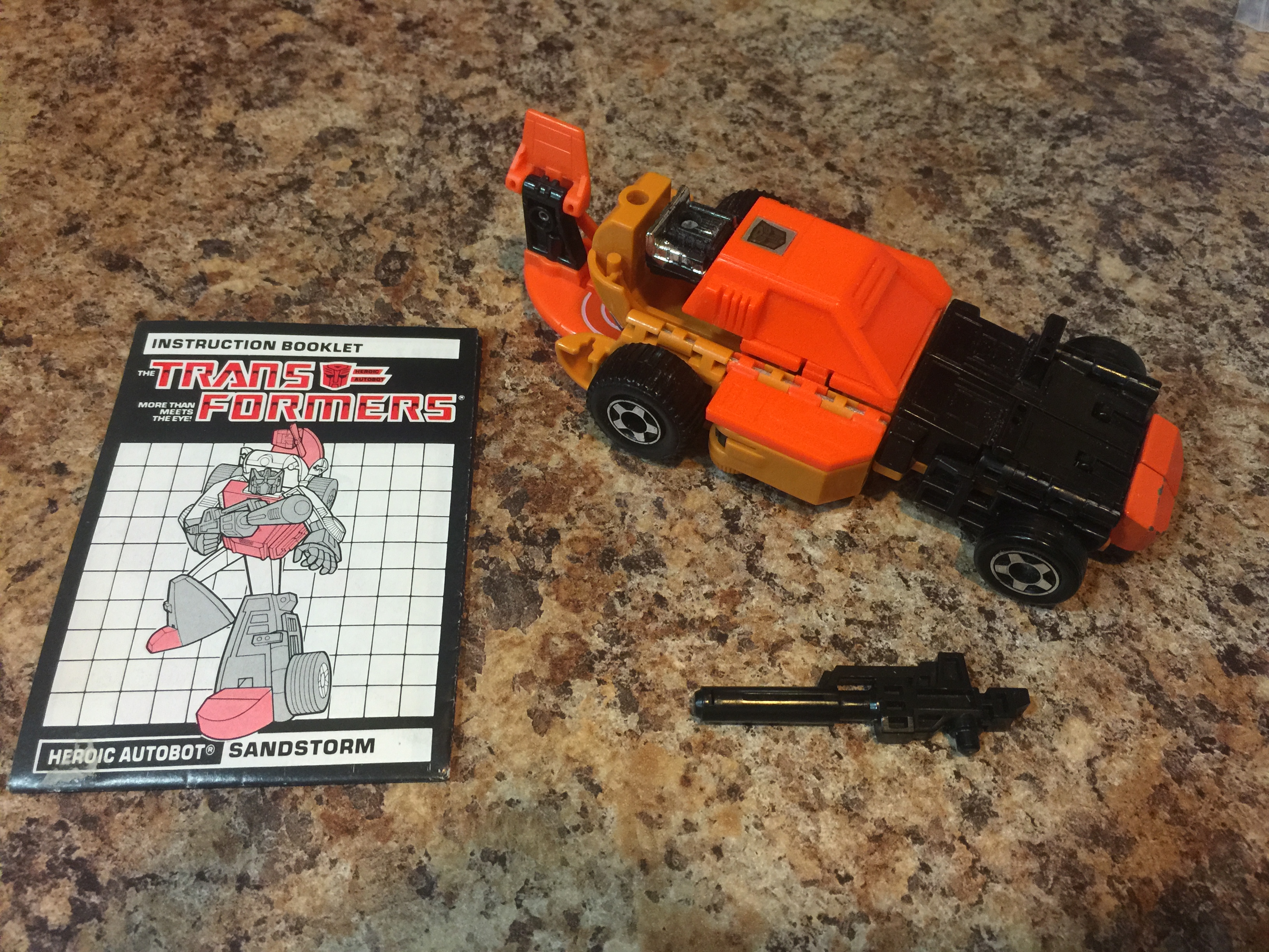 **I got Sandstorm in October 2015 on a good deal eBay purchase. He is complete with his instructions and Sandblaster Gun. He is in okay cosmetic condition but as of time of purchase needs stickers, has significant chrome wear on the engine on the back of his head and the rims on the driver side. Has some paint chips on his feet/front bumper.