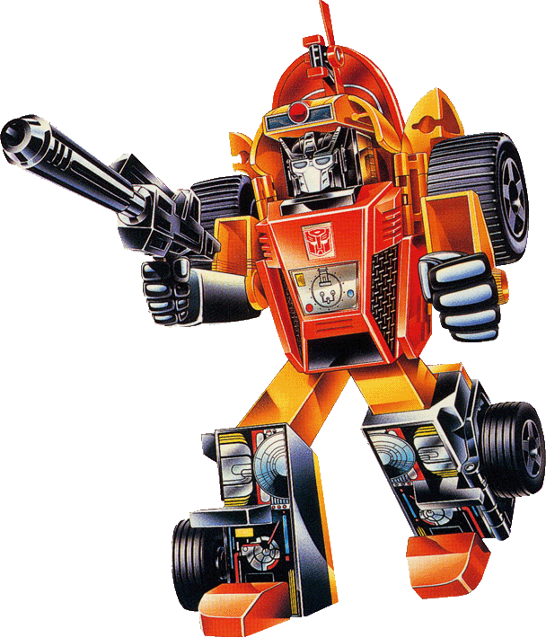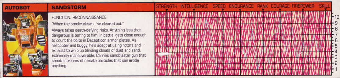 Profile: "Eat my dust" is Sandstorm's motto. He particularly enjoys quoting this as Decepticons are vainly pursuing him. Always willing to take the most death-defying risks, Sandstorm likes to get close enough to the enemy during his patrols so he can count the number of bolts in a Decepticon's armor plate. Only by being so daring, by getting his fuel pumping so strongly that he feels his internal circulatory hoses about to burst, does Sandstorm truly feel functional. He likes to live on the edge. Anything less than dangerous he finds boring, and when he's bored he's more likely to be in danger since his concentration lapses. Sandstorm fears only one thing: an end to the war. With no enemy to spy upon, he worries he will have no further useful purpose.