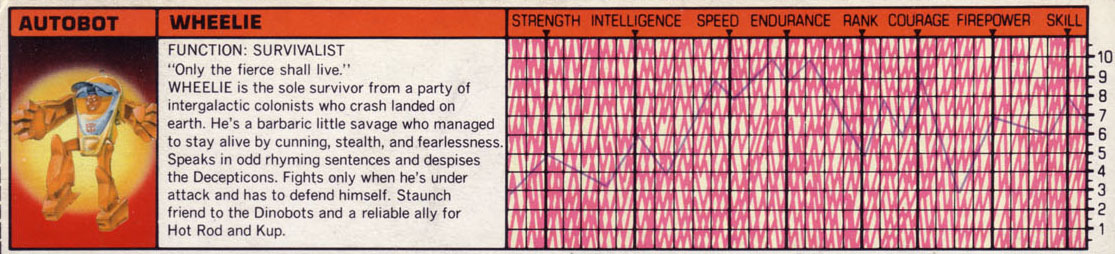Profile: Wheelie is the "wild boy" of Quintesson - an Autobot-like youth lost when his ship went down, the only survivor of his party, staying alive by cunning and stealth and fearlessness. He speaks in odd, rhyming sentences and despises the Sharkticons and Quintessons, who are his mortal enemies. He is a staunch friend to the Dinobots, who take to him immediately, and a reliable ally in difficulties for Hot Rod and Kup when they take on the Sharkticons.