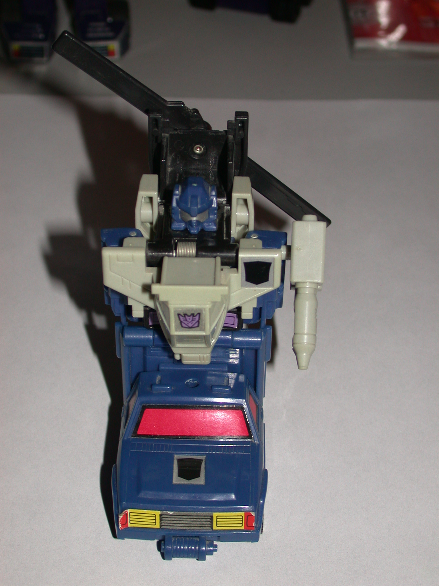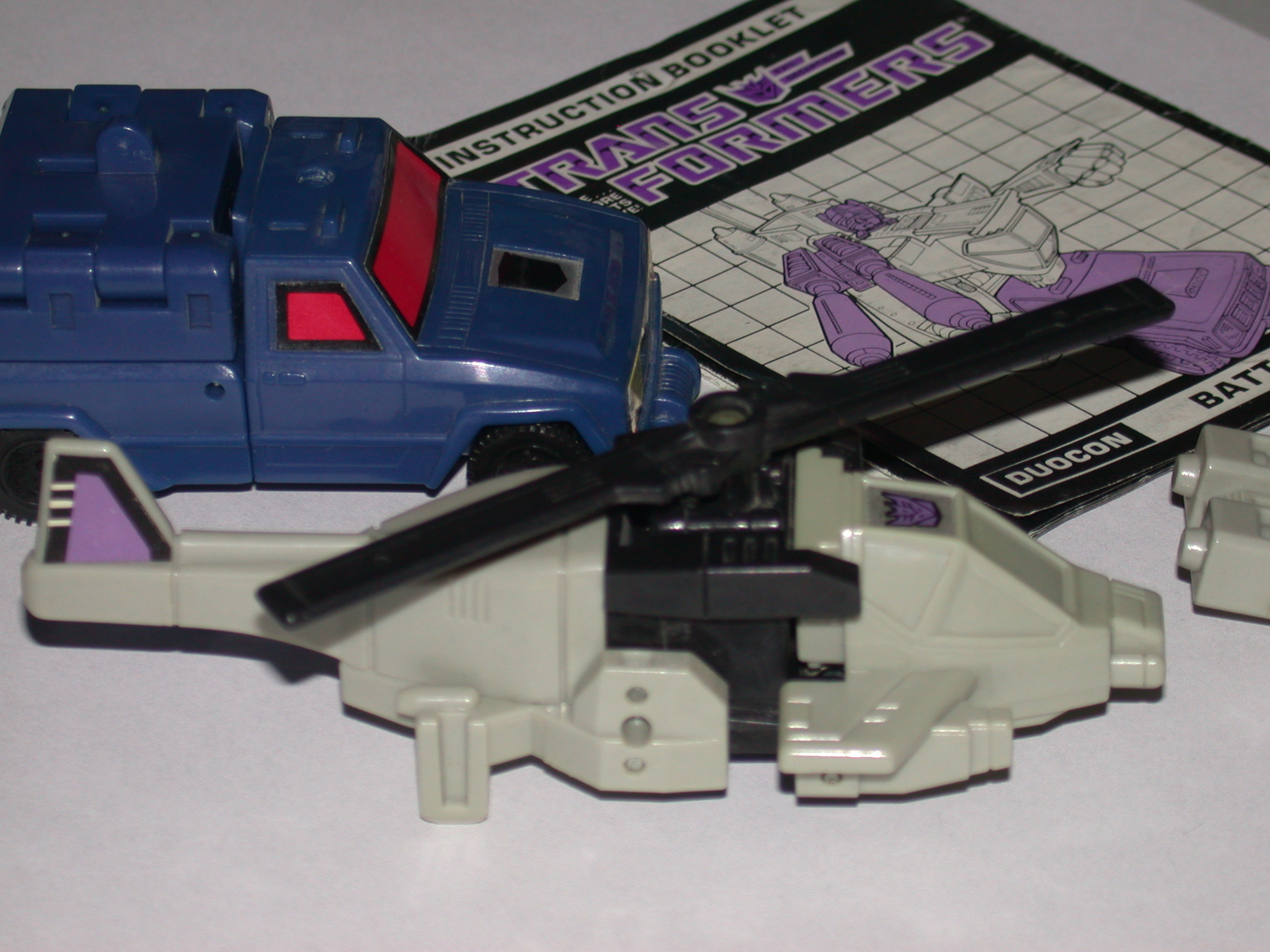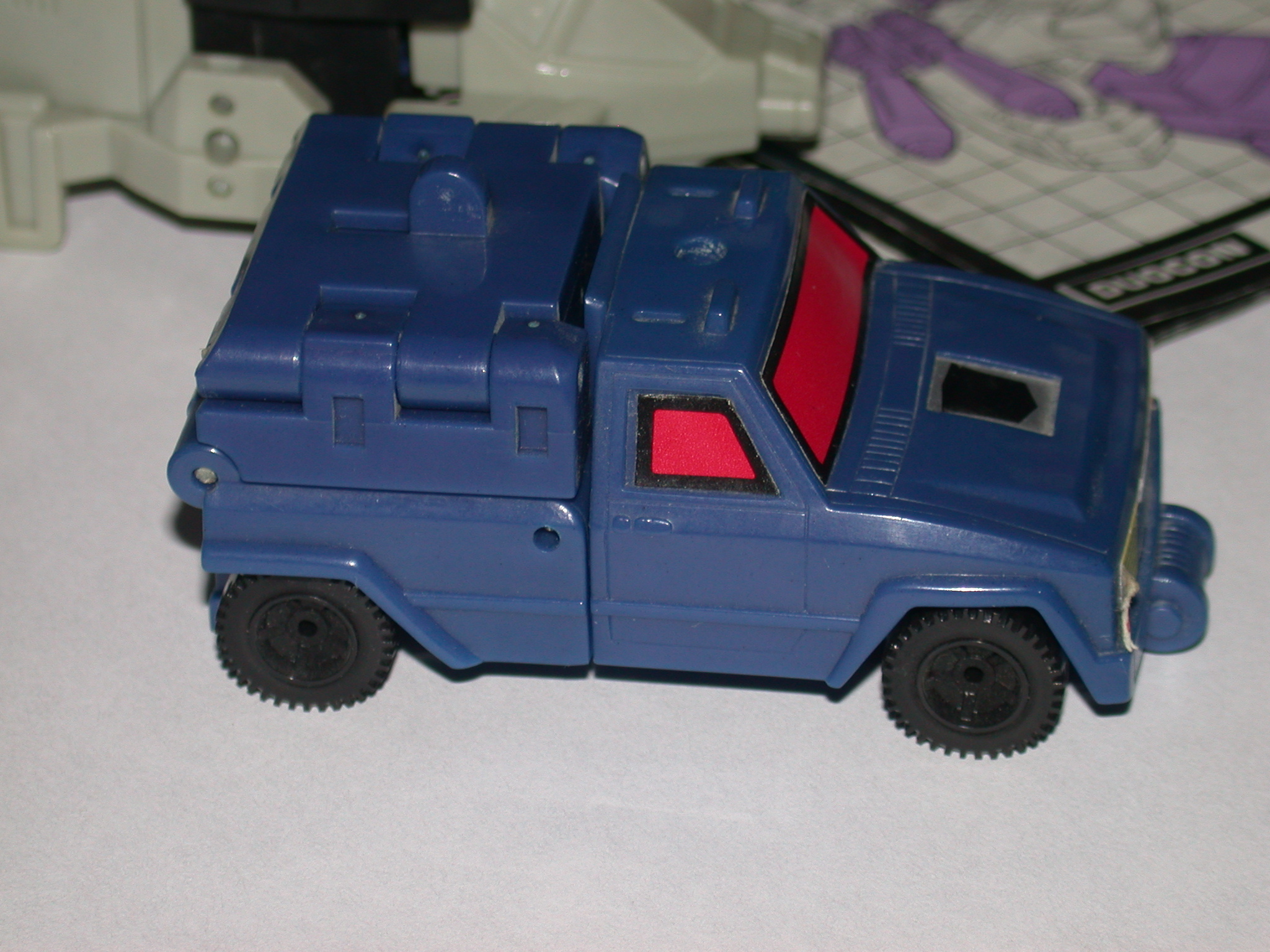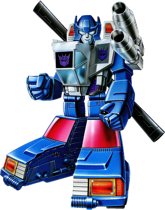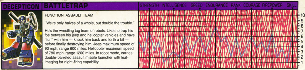 He's the wrestling tag team of robots. Likes to trap his foe between his jeep and helicopter vehicles and have "fun" with him -- knock him back and forth a bit -- before finally destroying him. Jeep maximum speed of 90 mph, range 600 miles. Helicopter maximum speed of 780 mph, range 1200 miles. In robot mode, carries double-barreled assault missile launcher with leaf-imaging for night-firing capability.