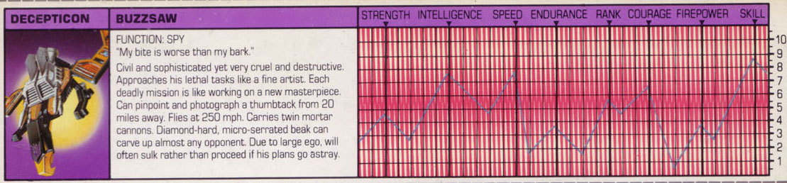 Profile: Given his reputation for civility and sophistication, it might seem surprising at first that Buzzsaw is also one of the cruelest and most destructive of all Decepticons. But his two sides are not contradictory. He carries out his lethal tasks with the careful, reasoned approach of a fine artist, with the cool precision of a neurosurgeon. He views every awful undertaking of his as the beginning of a new masterpiece. Every opponent he defeats marks a completion. And, like any true artist, nothing can sway him from his commitment to his deadly craft. He will only end his career when the Autobots are no more.
