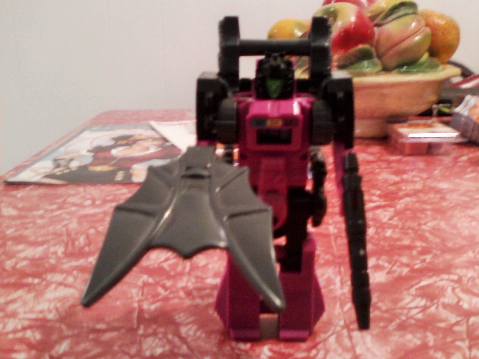A fearsome, foul-mouthed nightstalker. Rebels against authority in any form. Lashes out at anyone who even suggests his next course of action. His Decepticon superiors have more difficulty controlling him than the Autobots have fighting him. Binary-bonded to Brisko, a former Nebulan cartographer with a photographic memory. Shoots semi-automatic ion pulse gun. Tail converts to compressed air cannon that produces 200 mph gale force winds. Able to fly short distances in wolf mode.