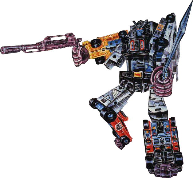 A clanking, crushing terror that destroys all in his path -- the ulimate Decepticon weapon if he wasn't so confused by the opposing thoughts of the 5 Stunticons who comprise him. (Motormaster is loathed by the other four.) Tremendous strength, his punch has the force of 140 tons. Impervious to most artillery. Uses Motormaster's cyclone gun and carries an ionizer sword with a 50,000 volt charge. | |||||||
