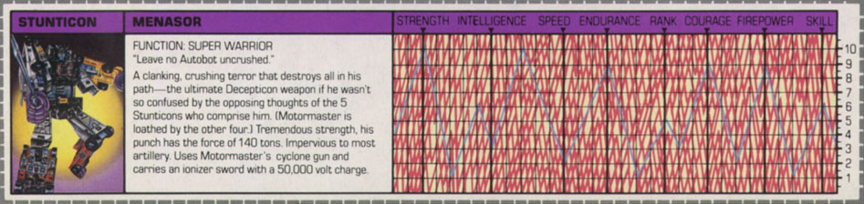 Profile: A clanking, crushing terror that destroys all in his path, Menasor is the ultimate Decepticon weapon - or, in theory at least, should be. For underneath his thick-plated hide is a mind wracked by indecision and conflict. All his actions are the hard-fought results of this ongoing internal struggle. Menasor is designed to mesh the thoughts of his five Stunticon components - Motormaster, Dead End, Breakdown, Drag Strip, and Wildrider - into one single-minded destruction machine. But Motormaster is so thoroughly loathed by the other four that a mental rift develops within Menasor, giving him a violently unstable personality. Although he strives to perform his lethal duties, Menasor is sometimes too confused to do anything but haphazardly lash out at anything near him. At these times his hands reach for his head as he strains to clear his thoughts. Like a child throwing a tantrum, he is at his most uncontrollable in this state - and also his most dangerous.
