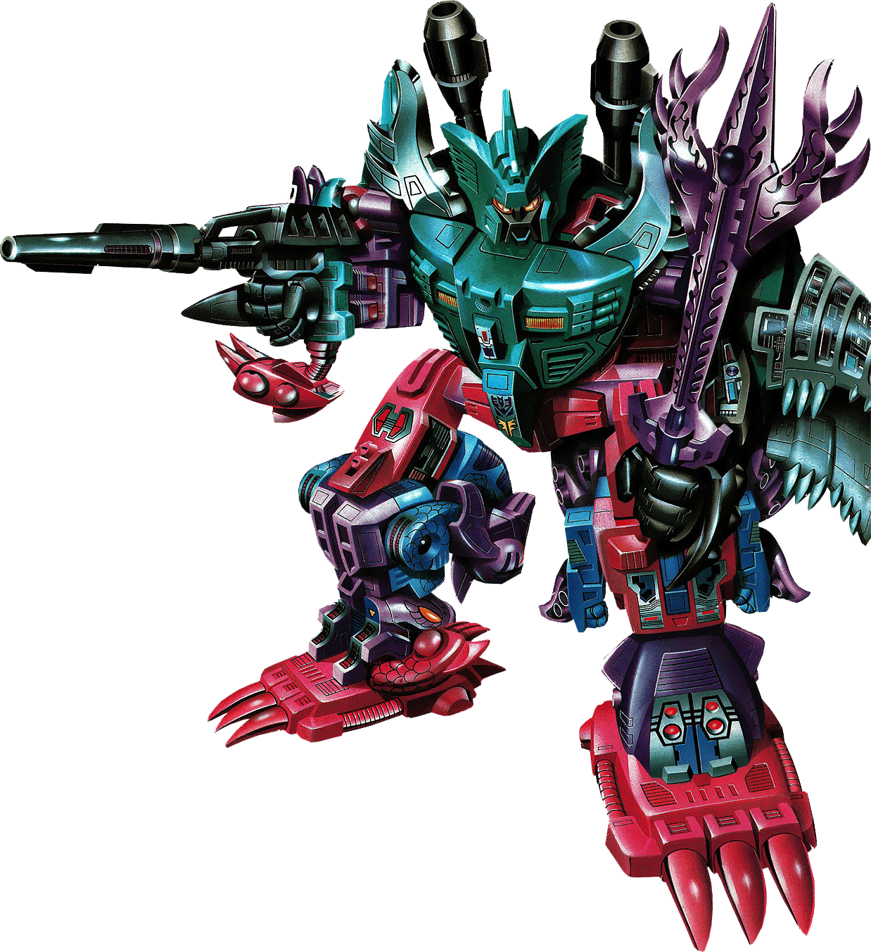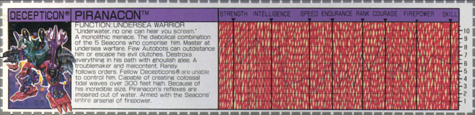 A monolitic menace. The diabolical combination of the five Seacons who comprise him. Master at undersea warfare. Few Autobots can outdistance him or escape his evil clutches. Destroys everything in his path with ghoulish glee. A troublemaker and malcontent. Rarely follows orders. Fellow Decepticons are unable to control him. Capable of creating colossal tidal waves over 300 feet high. Because of his incredible size, Piranacon's reflexes are impaired out of water. Armed with the Seacons' entire arsenal of firepower. | |||||||