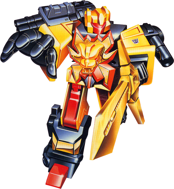 All business. Hates waste in any form... won't burn an extra drop of fuel unless he's certain the results will be worth the effort. Long stretches of inactivity often mistaken for laziness. Explodes into furious, ferocious action when it's time to strike. As a lion, can leap distances as long as a football field. Claws can rip through foot-thick steel. Has twin concussion blasters and sonic sword. Combines with fellow Predacons to form Predaking. | |||||||