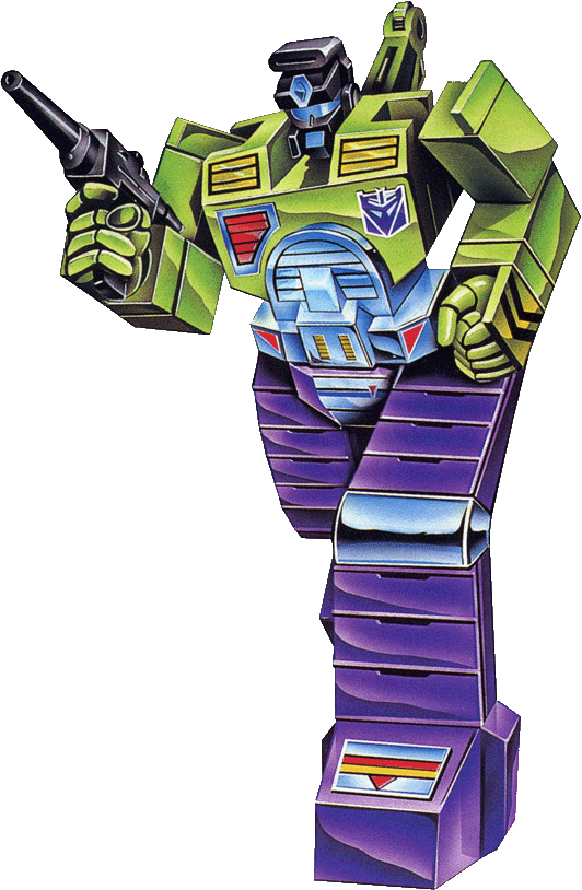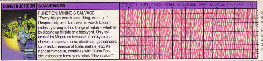 Profile: Desperately tries to prove his worth to comrades by trying to find things of value -- whether by digging up a hillside or a backyard. Only tolerated because of ability to use shovel's magnetic, ionic, electrical, gas sensors to detect presence of fuels, metals, etc. As right arm module, combines with fellow Constructicons to form giant robot Devastator".