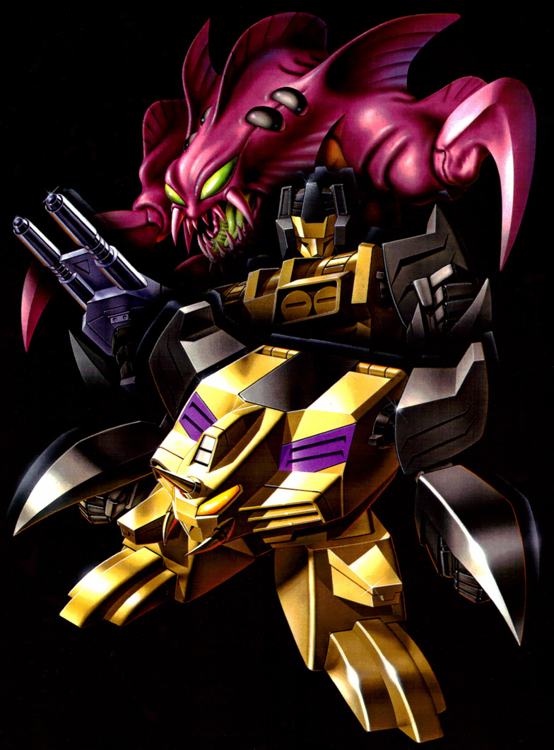 He has taken sculpture out of the art studio and transplanted it onto the battlefield. In his Pretender guise, he can whittle an Autobot warrior into an abstract wreck within minutes. He considers his carved-up conquests to be renowned masterpieces. His diamond-steel alloy talons can tear through any material known to man or robot. Enclosed creature/robot is armed with a magnetic repellor-attractor which rips iron-bearing opponents into microscopic pieces. | |||||||
