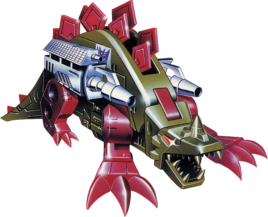 Abilities: In cassette mode, Slugfest has a vast data storage capacity. He can record and store up to 1.2 billion bits of data via visual, audio and electrical inputs. In stegosaurus mode, he can use the armored plates on his back like the teeth of a chainsaw to cut through virtually any substance. He carries two side-mounted solar-powered vibro-cannons. When fully charged (after at least an hour's exposure to sunlight), the vibro-cannons can shoot beams of harmonic sonic energy that can shatter a bridge.