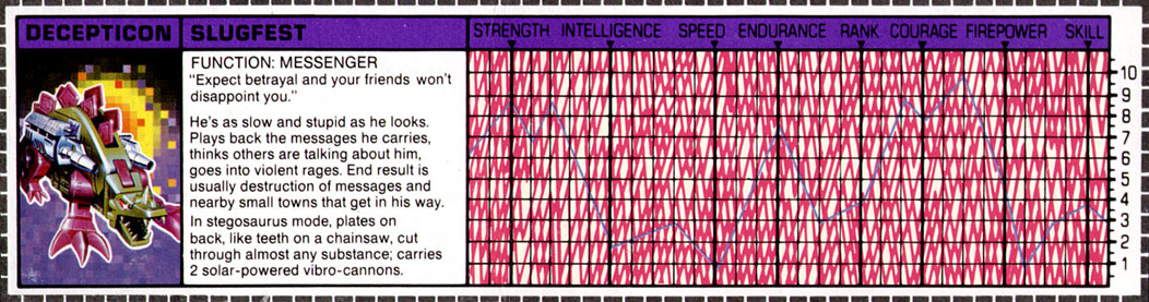 Weaknesses: In addition to being slow and stupid, Slugfest is prone to jamming when he's playing back messages in his cassette mode. In stegosaurus mode, his leg joints often lock into place, hobbling or even immobilizing him.