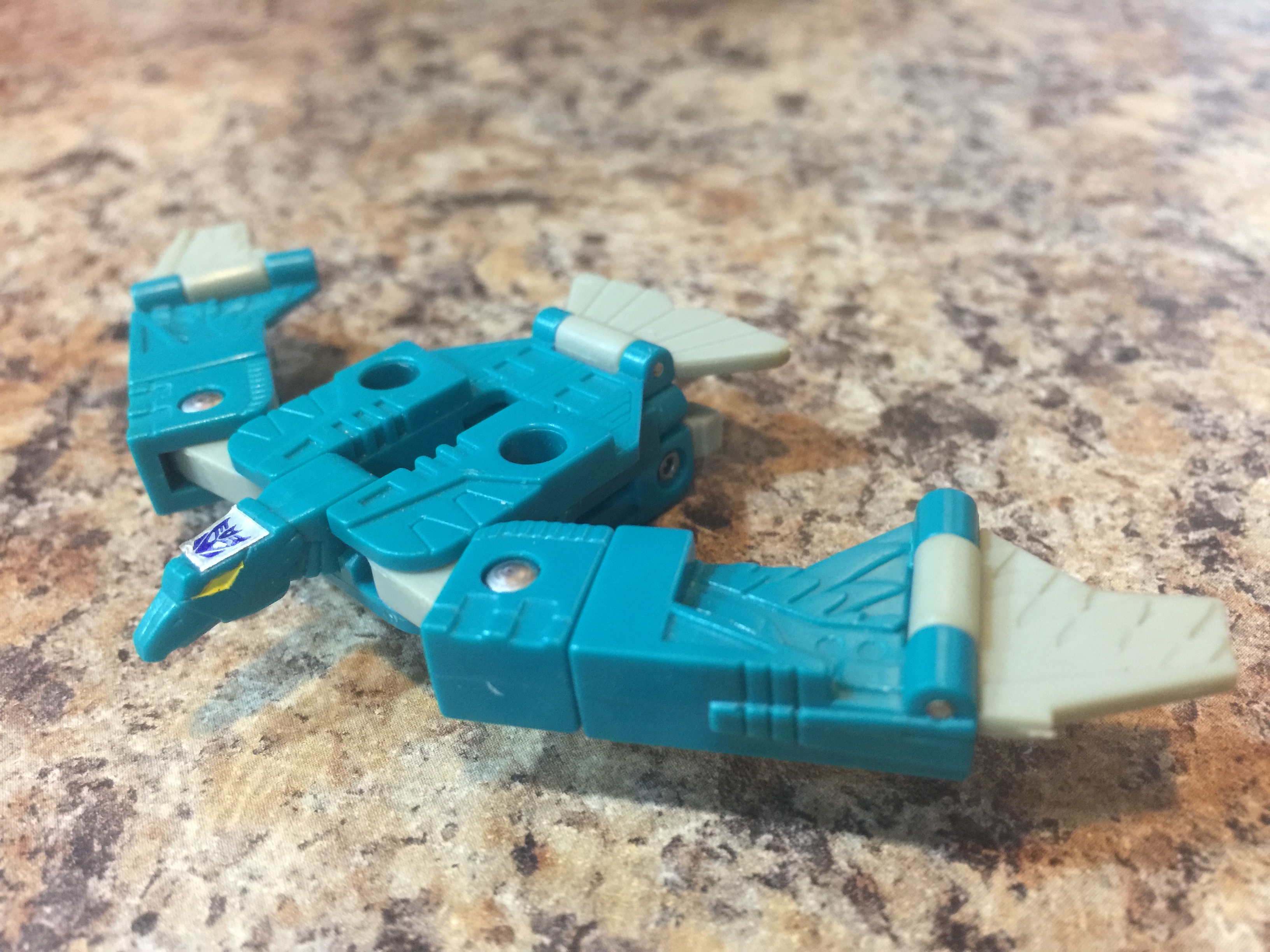 Profile: Never stops talking except to refill his fuel tank. Knows over 250 Earth and 6300 alien languages, but never has anything important to say in any of them. Other Decepticons often threaten to rip out his vocal circuitry and wrap it around his beak to shut him up. Carries two deafening high decibel sonic boomers. Combines with Beastbox to form robot Squawkbox.
