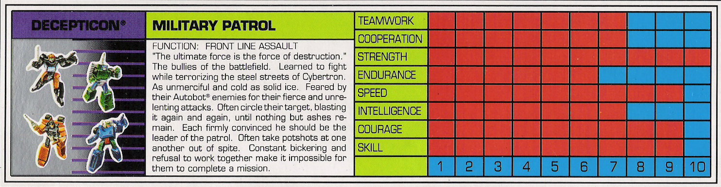 Profile: The bullies of the battlefield. Learned to fight while terrifying the steel streets of Cybertron. As unmerciful and cold as solid ice. Feared by their Autobot enemies for their fierce and unrelenting attacks. Often circle their target, blasting it again and again until nothing but ashes remain. Each firmly convinced he should be the leader of the patrol. Often take potshots at one another out of spite. Constant bickering and refusal to work together make it impossible for them to complete a mission.