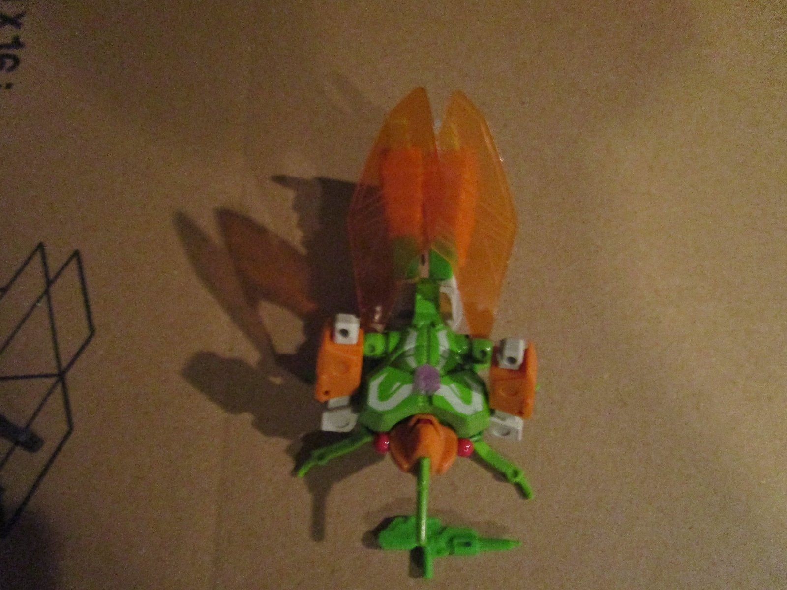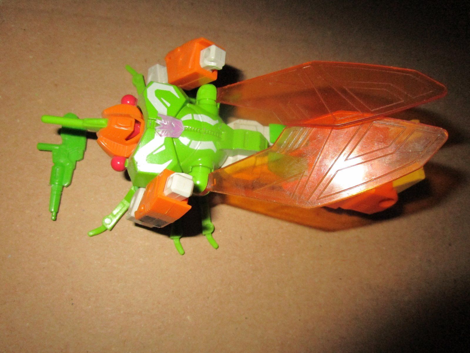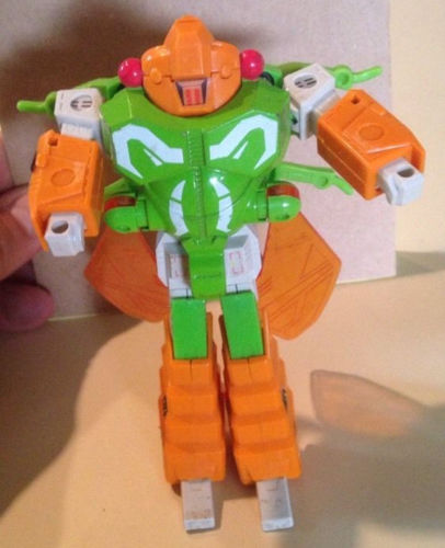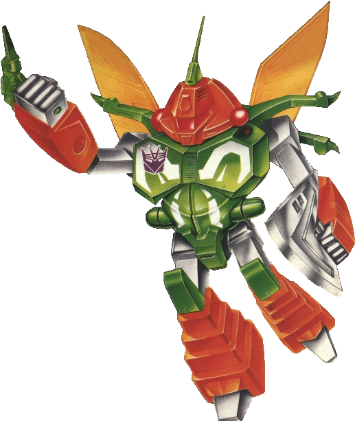Profile: Will use his poisonous talents even on fellow Decepticons because he trusts no one and suspects everyone is trying to usurp his role as leader. His stinger can discharge fluids harmful to mechanical and organic life; corrosive acids, destructive catalysts, paralyzing toxins, and others. Stinger can penetrate 1/4 inch steel, but sometimes gets stuck and breaks off. Flies at 15mph for 300 miles. Carries electro-blaster in robot form.