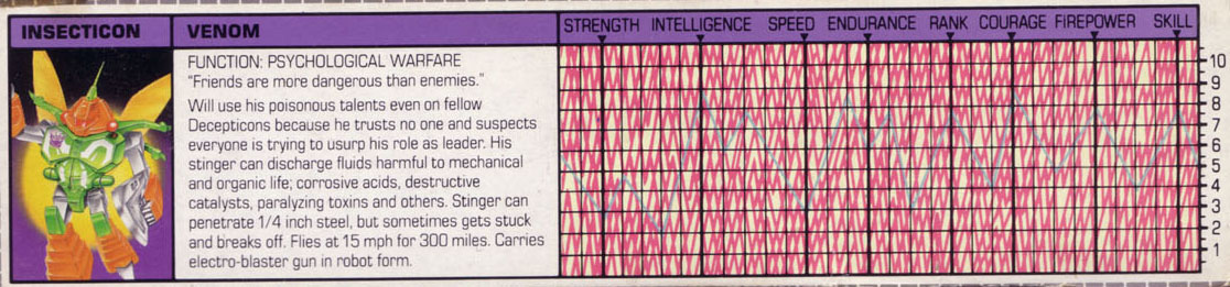 Will use his poisonous talents even on fellow Decepticons because he trusts no one and suspects everyone is trying to usurp his role as leader. His stinger can discharge fluids harmful to mechanical and organic life; corrosive acids, destructive catalysts, paralyzing toxins, and others. Stinger can penetrate 1/4 inch steel, but sometimes gets stuck and breaks off. Flies at 15mph for 300 miles. Carries electro-blaster in robot form.