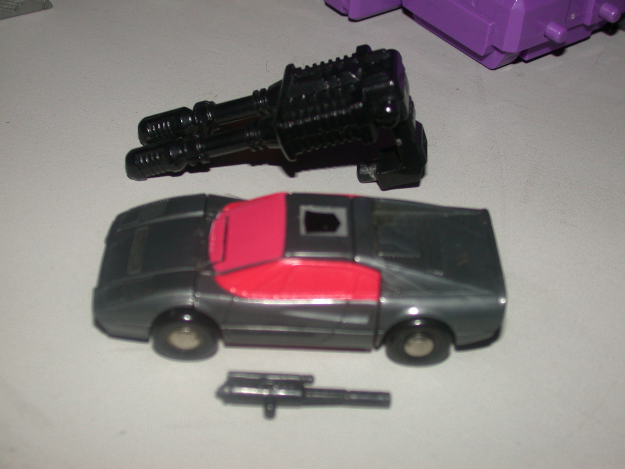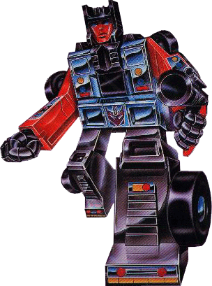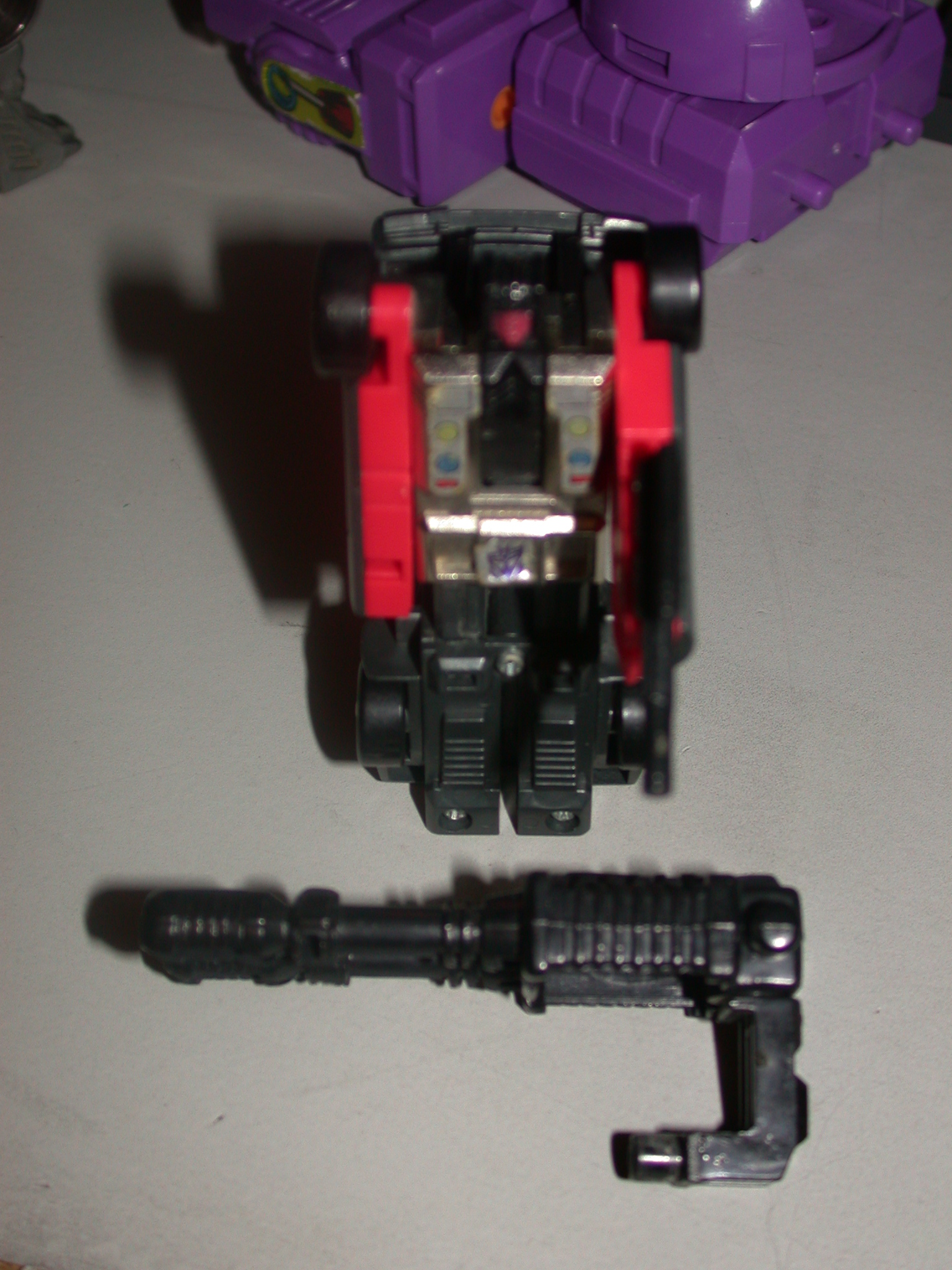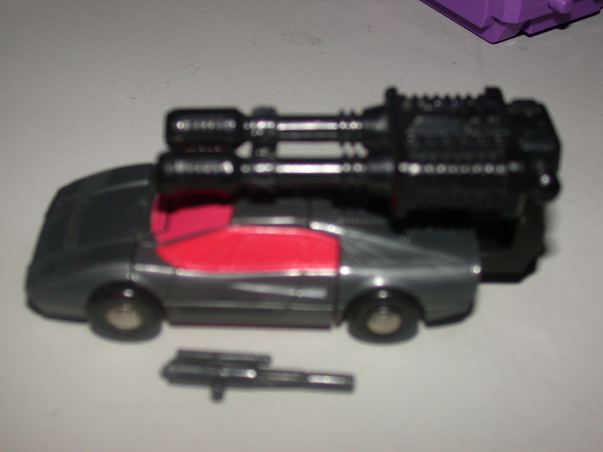 Look out motorists -- he exults in the accidents he causes! Driving recklessly, screaming and laughing. Some comrades think it's an act, others really know he's as nuts as he appears. Fears quiet, prone to tire blow-outs. In car mode goes up to 250mph with amazing maneuverability. In robot mode, his scattershot gun sprays laser beams over wide areas. Combines with fellow Stunticons to form "Menasor".