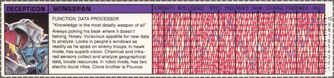 Always poking his beak where it doesn't belong. Nosey. Voracious appetite for new data to analyze. Looks in people's windows as readily as he spies on enemy troops. In hawk mode, has superb vision. Chemical and infra-red sensors collect and analyze geographical data, locate resources. In robot mode, has two electro-burst rifles. Clone brother is Pounce. | |||||||
