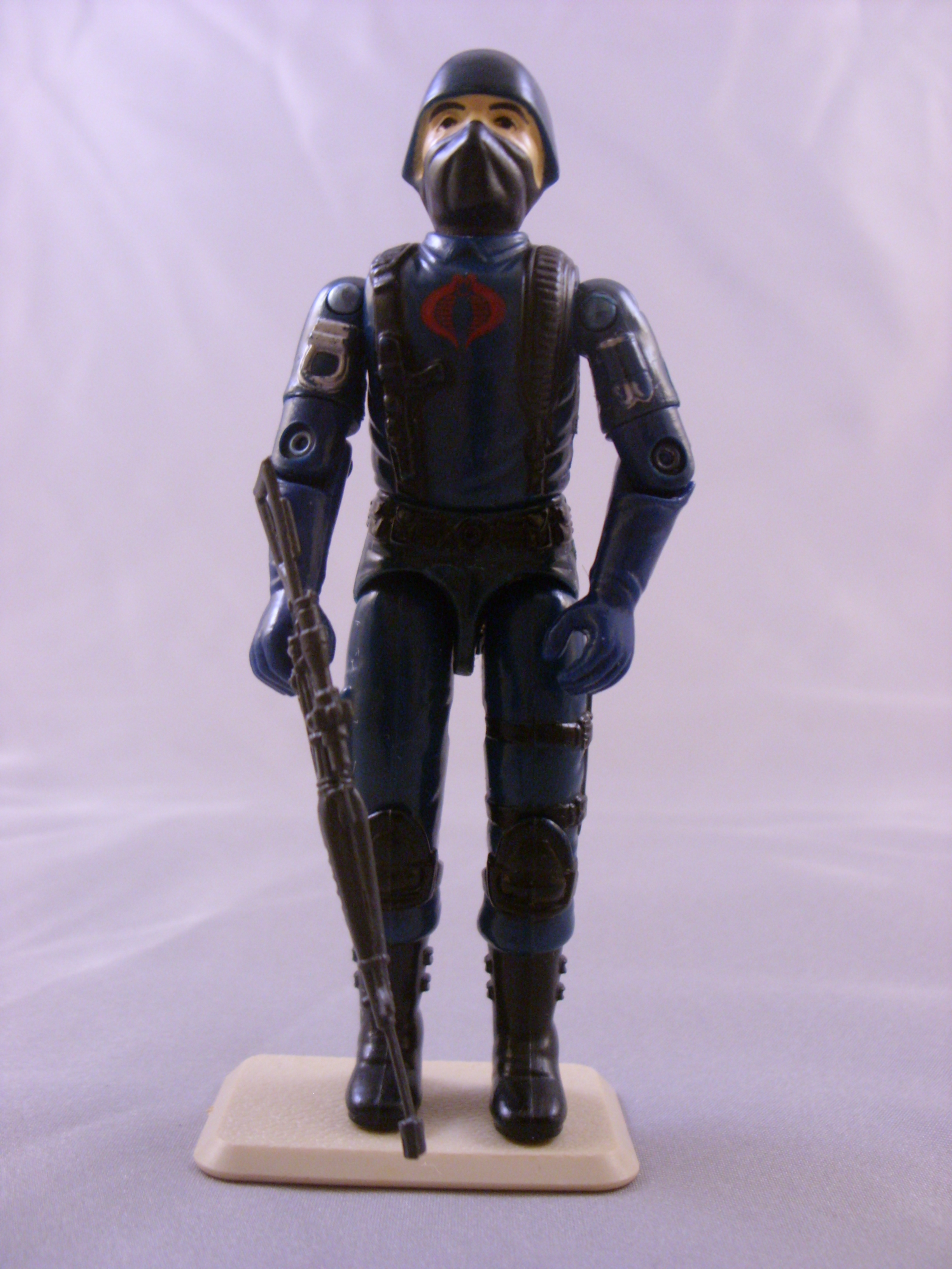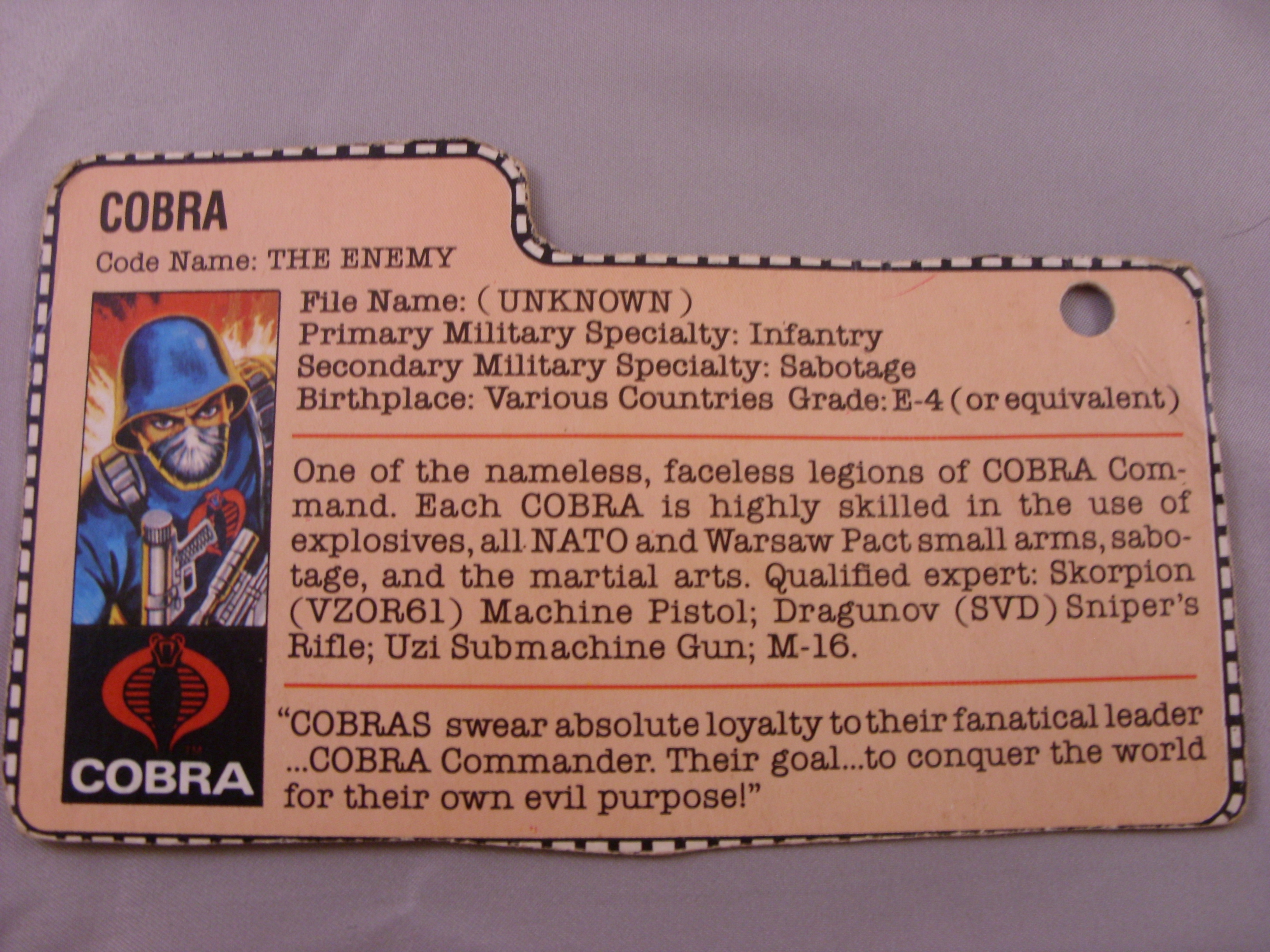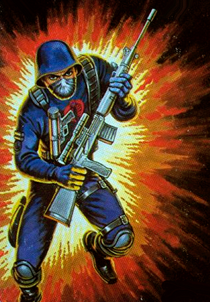 Code Name: THE ENEMY One of the nameless, faceless legions of COBRA Command. Each COBRA is highly skilled in the use of explosives, all NATO and Warsaw Pact small arms, sabotage, and the martial arts. Qualified expert: Skorpion (VZOR61) Machine Pistol; Dragunov (SVD) Sniper's Rifle; Uzi Submachine Gun; M-16. "COBRAS swear absolute loyally to their fanatical leader... COBRA Commander. Their goal...to conquer the world for their own evil purpose!"