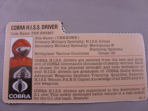 Code Name: THE ENEMY Cobra H.I.S.S. drivers are selected from the best and most evil of COBRA Commander's thousands of yearly recruits. Each is chosen for his physical strength and total dedication to evil! H.I.S.S. drivers are graduates of: COBRA Battle School, Advanced Weapons Systems Training. Qualified Experts: H.I.S.S. Vehicle, F.A.N.G. Copter, knowledge of all NATO and G.I. Joe weapons. Cobra H.I.S.S. drivers are committed to the destruction of G.I.Joe! This newly developed battle vehicle is a real match for the G.I.Joe team. Beware!