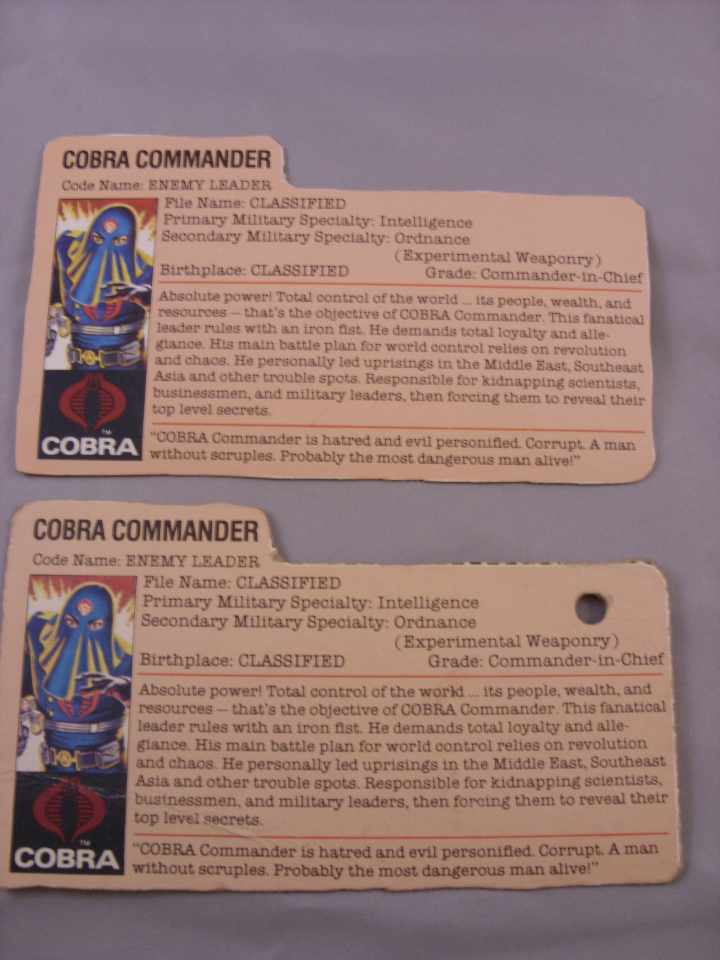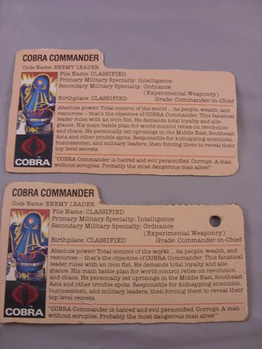 Absolute power! Total control of the world...its people, wealth, and resources--that's the objective of COBRA Commander. This fanatical leader rules with an iron fist. He demands total loyalty and allegiance. His main battle plan for world control, relies on revolution and chaos. He personally led uprisings in the Middle East, Southeast Asia and other trouble spots. Responsible for kidnapping scientists, businessmen, and military leaders, then forcing them to reveal their top level secrets.