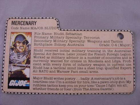 Bludd received initial military training in the Australian Special Air Service. Later joined the French Foreign Legion. Worked as military advisor in a number of countries and is currently wanted for crimes in Rhodesia and Libya. Proficient with every form of infantry weapon in current use. Bludd has a tactical mind like a steel trap. Qualified Expert: All NATO and Warsaw Pact small arms.