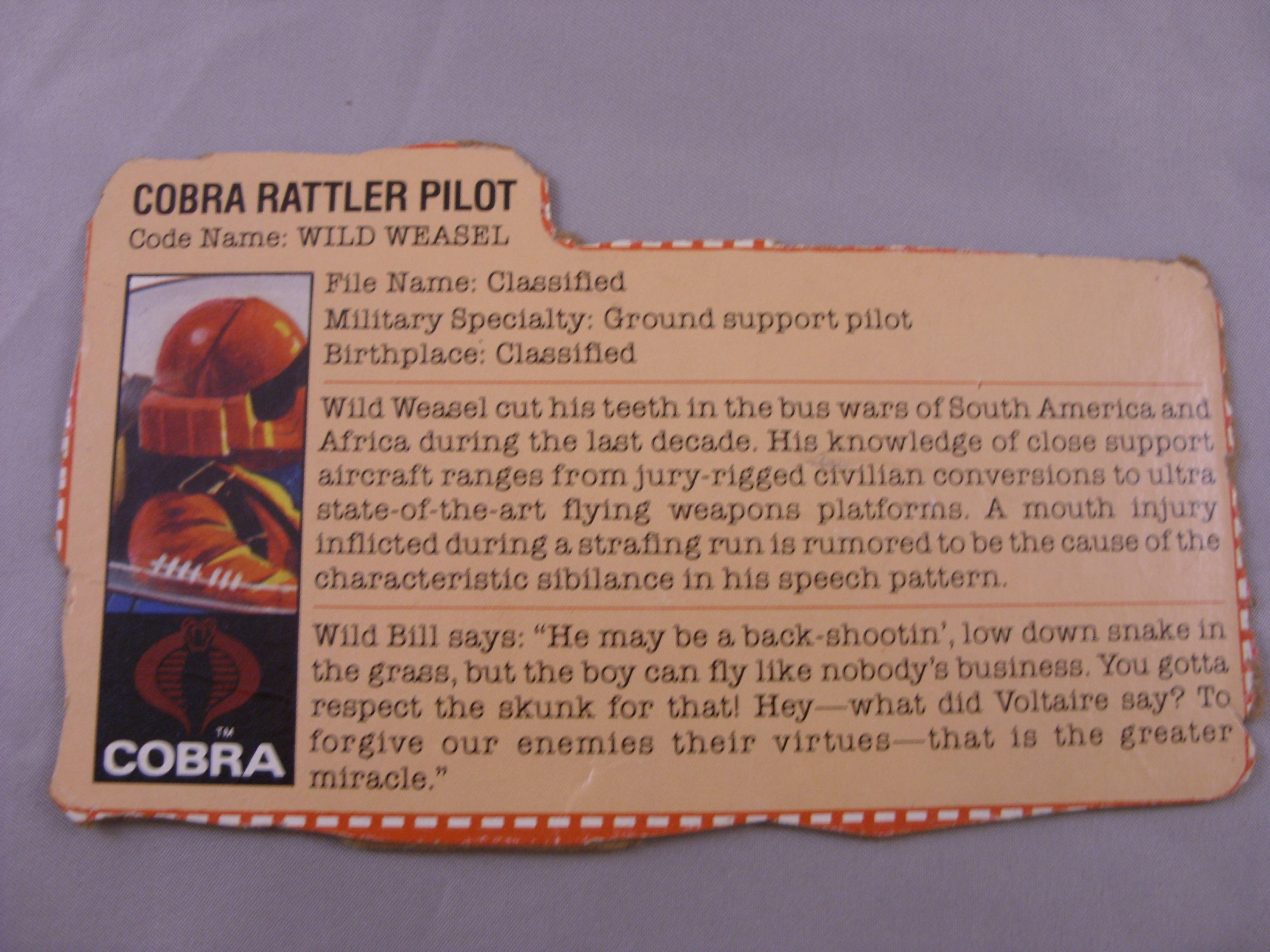 My Personal Notes: Wild Weasel was a cool Cobra I got early in my army building as a kid. I really loved getting him and the Rattler and thought he was cool since he was one of the largest combos I was able to buy on my own as a kid (Got him and the Rattler after the Water Moccasin, so the feeling continued). The Rattlers (got a second from my cousin sans Wild Weasel as a kid) hasn't fared so well through the years of storage and travel, but Wild Weasel is still in pretty good shape. |