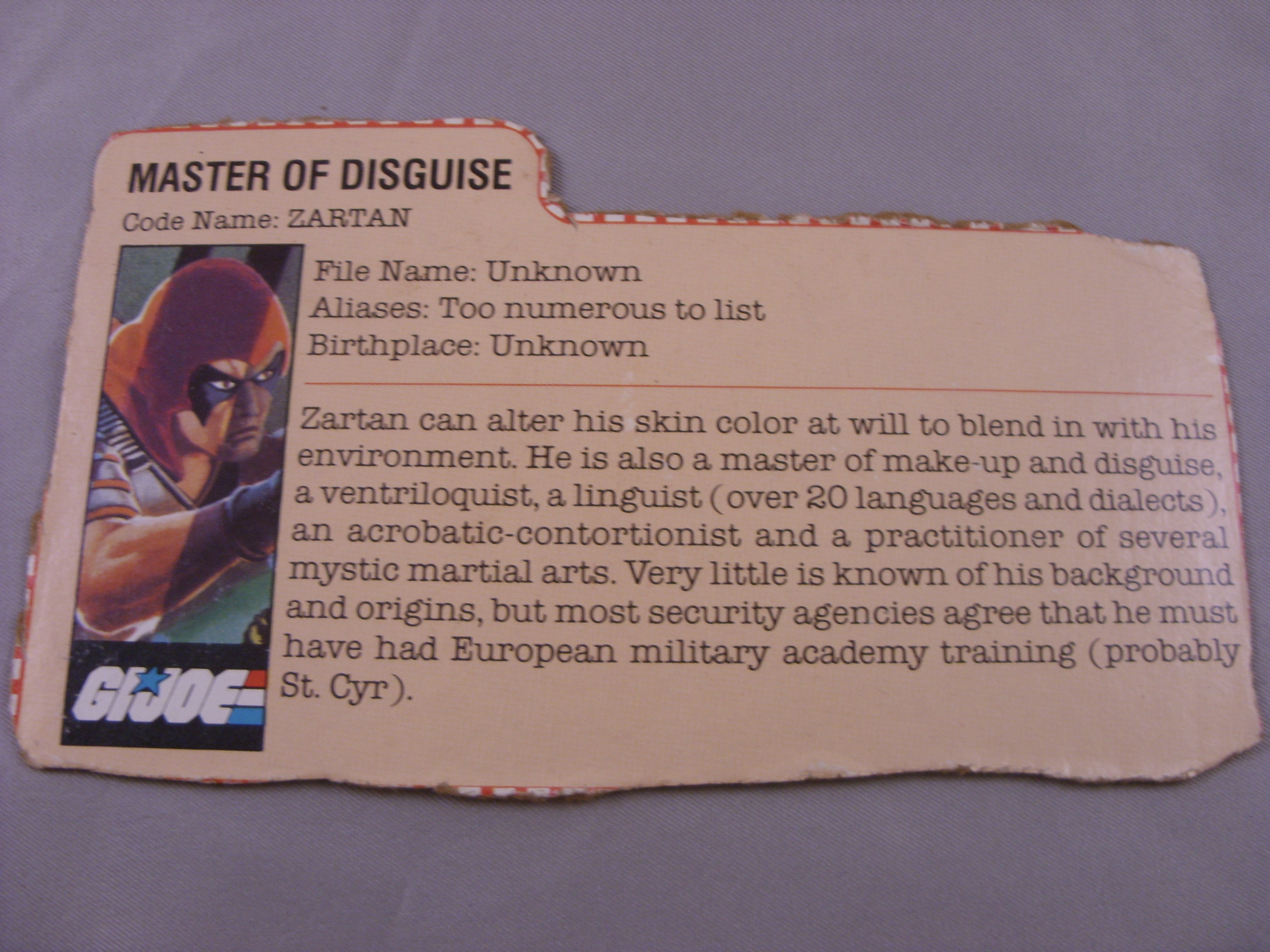 Zartan can alter his skin color at will to blend in with his environment. He is also a master of make-up and disguise, a ventriloquist, a linguist (over 20 languages and dialects), an acrobatic-contortionist and a practitioner of several mystic martial arts. Very little is known of his background and origins, but most security agencies agree that he must have had European military academy training (probably St. Cyr).