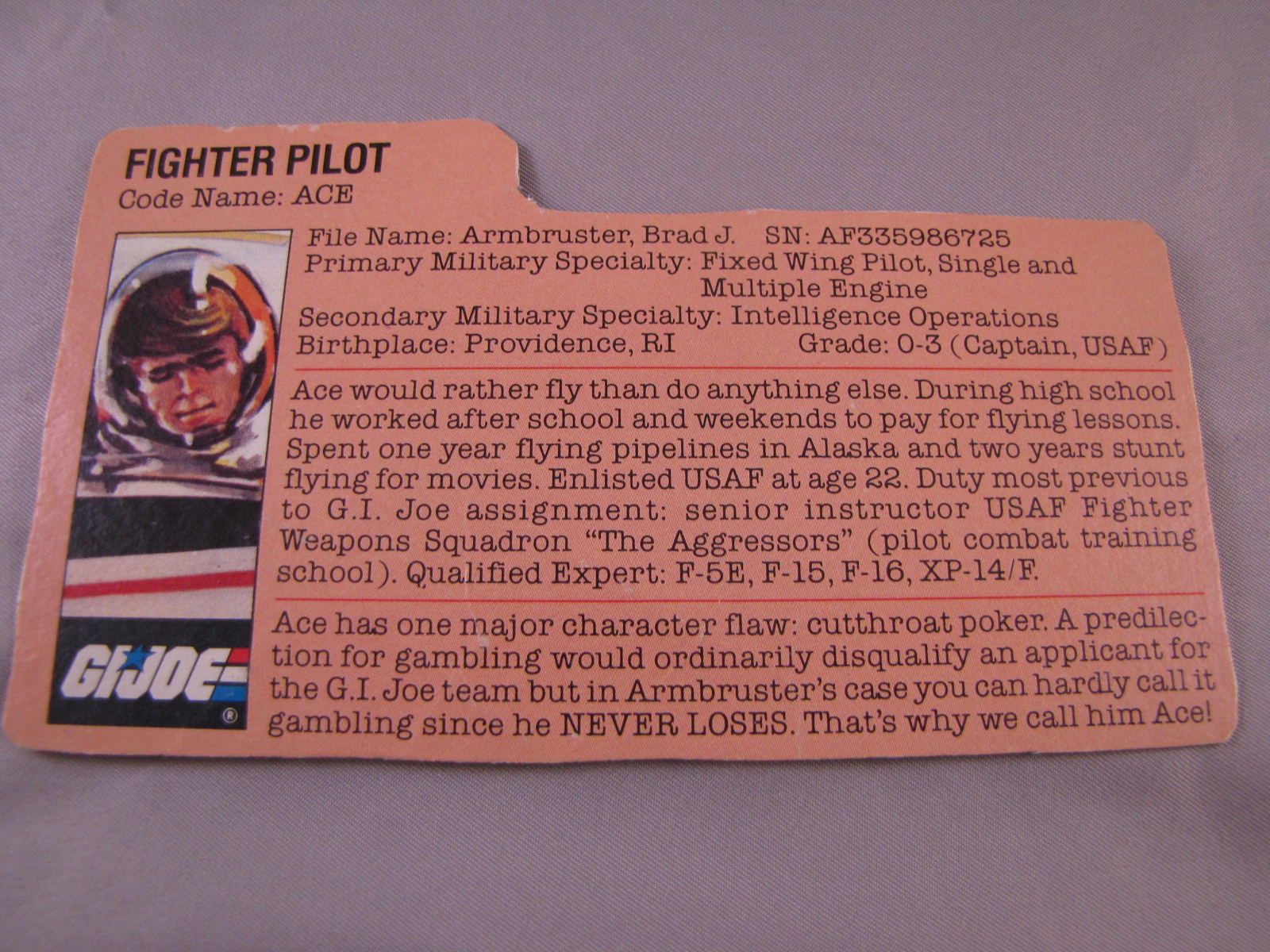 Ace would rather fly than do anything else. During high school he worked after school and weekends to pay for flying lessons. Spent one year flying pipelines in Alaska and two years stunt flying for movies. Enlisted USAF at age 22. Duty most previous to G.I.Joe assignment: senior instructor USAF Fighter Weapons Squadron "The Aggressors" (pilot combat training school). Qualified Expert: F-5E, F-15, F-16, XP-14/F.