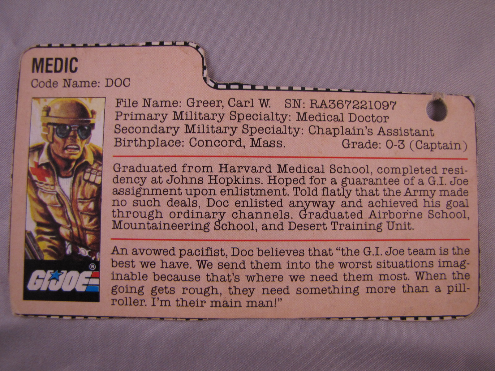 An avowed pacifist, Doc believes that "the G.I. Joe team is the best we have. We send them into the worst situations imaginable because that's where we need them most. When the going gets rough, they need something more than a pill roller. I'm their man!"