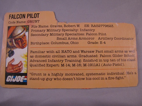 My Personal Notes: Grunt the pilot was a mixed bag for me. I got him from my cousin I believe, but without his glider. I was obviously happy to get another Grunt, but I really hated never having the Glider, and I was never able to get one to this day. He is complete with his helmet and file card. |