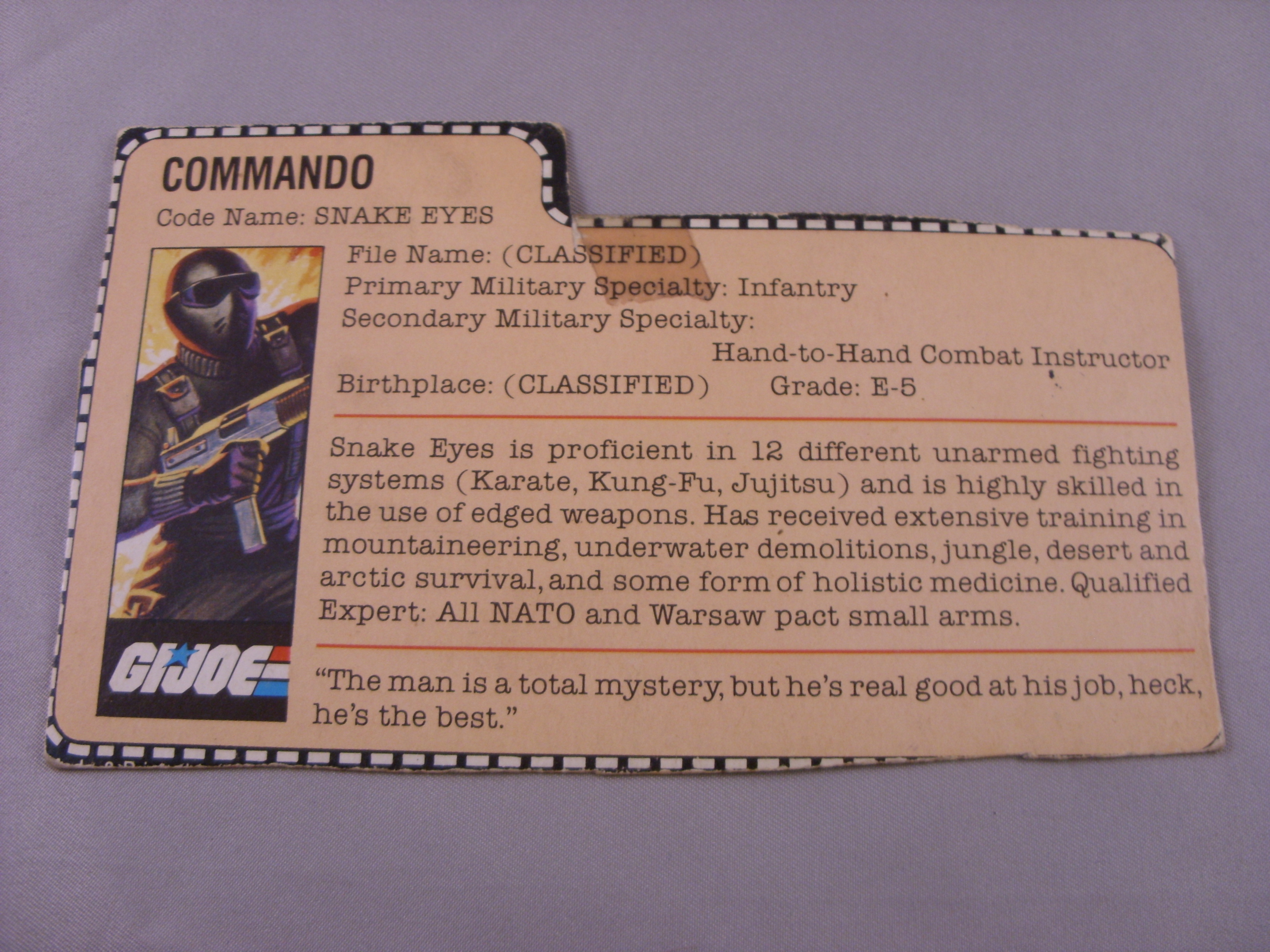 Code Name: SNAKE EYES Snake Eyes is proficient in 12 different unarmed fighting systems (Karate, Kung-Fu, Jujitsu) and is highly skilled in the use of edged weapons. Has received extensive training in mountaineering, underwater demolitions, jungle, desert and arctic survival, and some form of holistic medicine. Qualified Expert: All NATO and Warsaw pact small arms. "The man is a total mystery, but he's real good at his job, heck, he's the best."