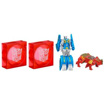 Pop into some "explosive" Transformers action with these special Autobot Rewind and Sunder figures! These Autobot warriors lie in wait in sneaky data disc mode until an unsuspecting Decepticon comes by. With the push of a button, these Autobot Rewind and Sunder figures come flying out in robot mode! Will the Decepticons be able to handle your lightning-quick Autobot Rewind and Sunder figures? Only you can decide!