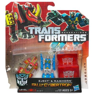 Pop into some "explosive" Transformers action with these special Eject and Ramhorn figures! These Autobot warriors lie in wait in sneaky data disc mode until an unsuspecting Decepticon comes by. With the push of a button, these Eject and Ramhorn figures come flying out in robot mode! Will the Decepticons be able to handle your lightning-quick Eject and Ramhorn figures? Only you can decide!